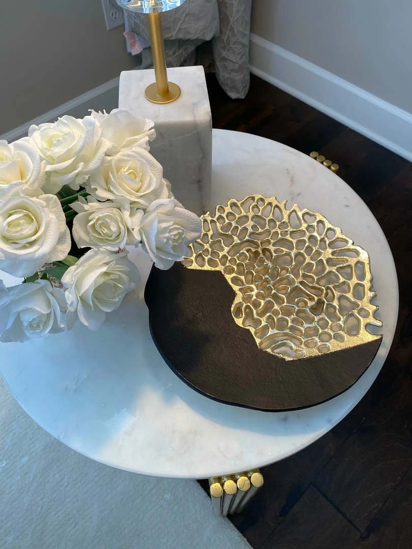 Description: This intricate black and gold plate features a very unique design that will draw eyes! Display on your coffee table or on your kitchen counter, what a cool way to mix and match colors!