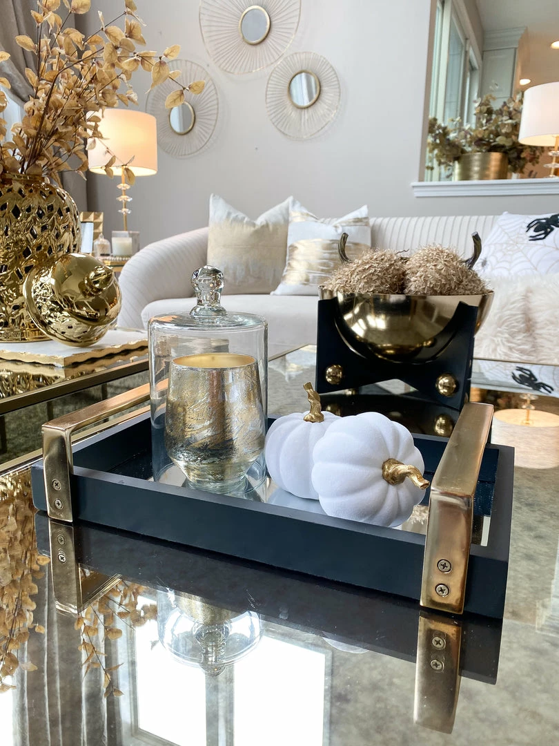Description: This sleek black mirrored tray has a functional, fresh and a fabulous look with its gold metal handles and cool rivet details on the sides, and can work with many different design styles.