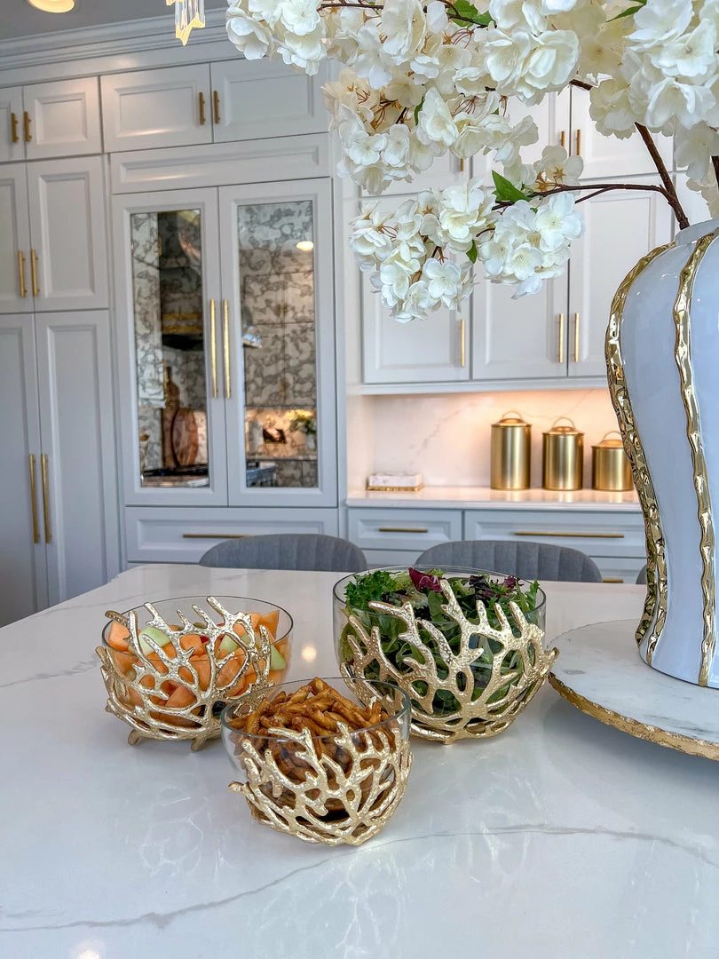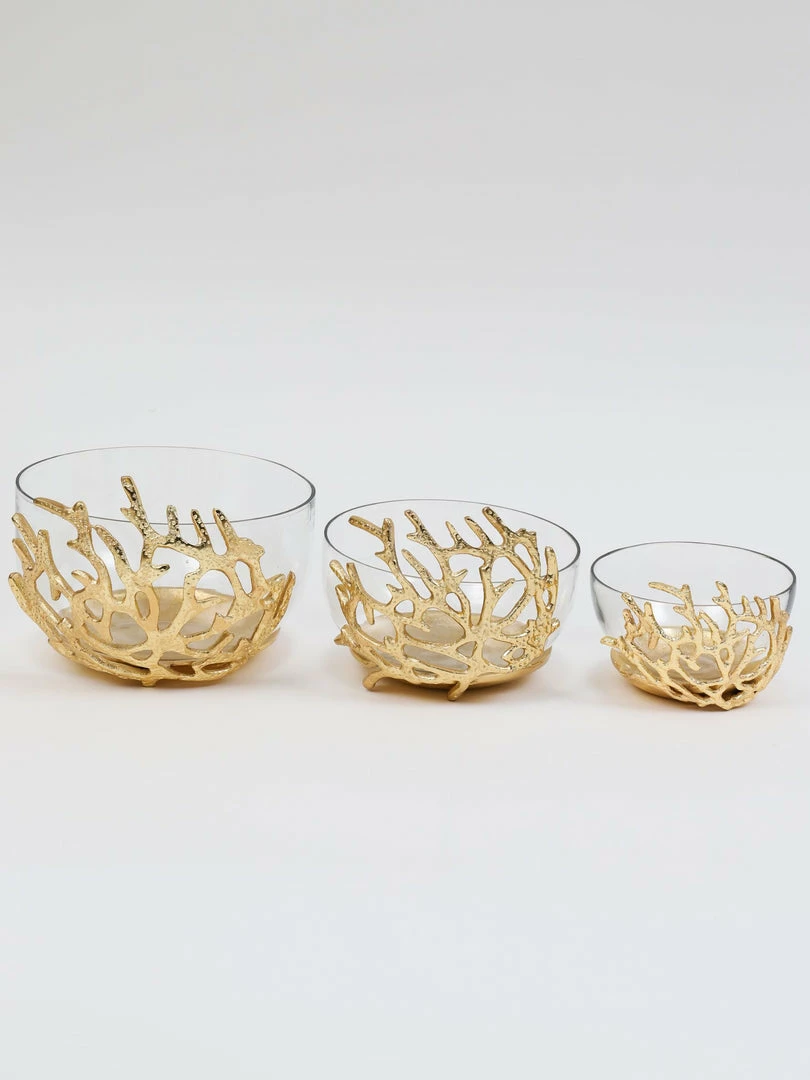 Description: These stunning textured design bowls come in 3 sizes. They can be used as snack bowls, or decor on a coffee table! The glass comes out for easy washing.