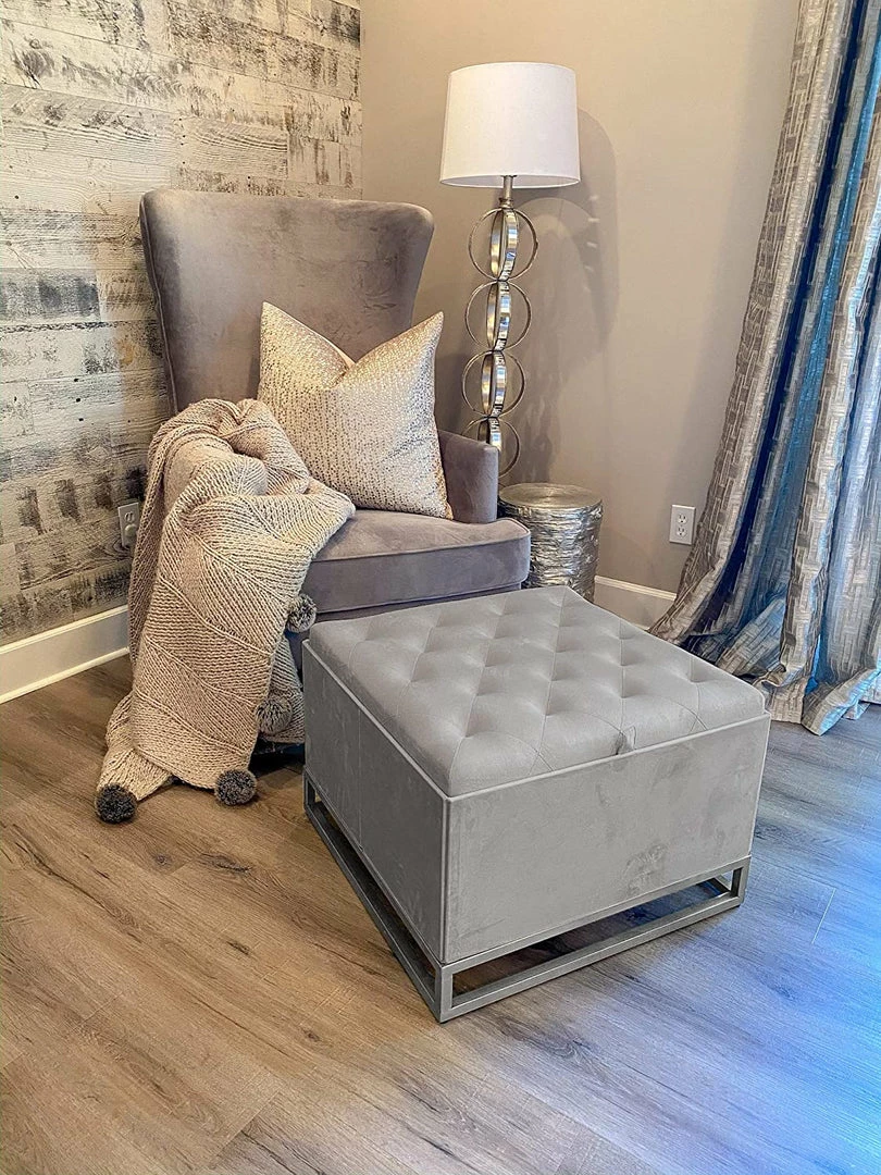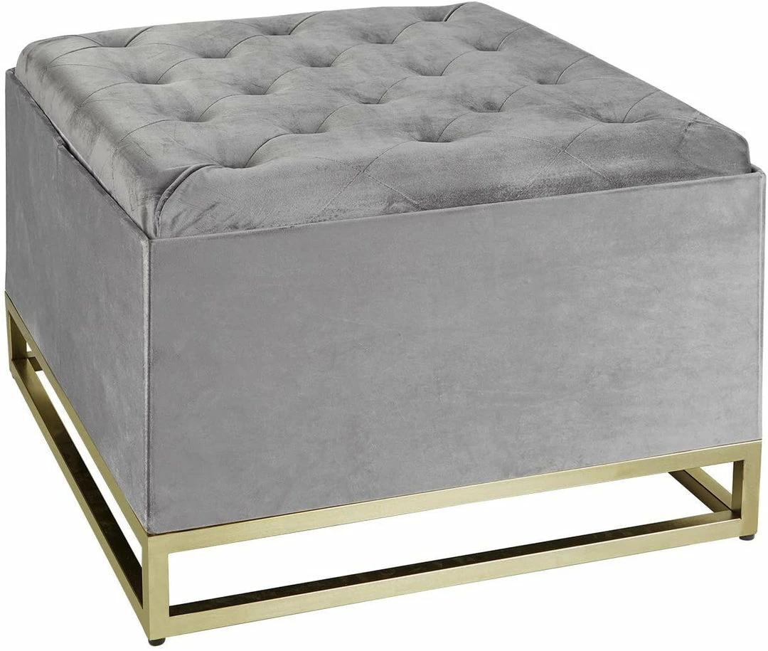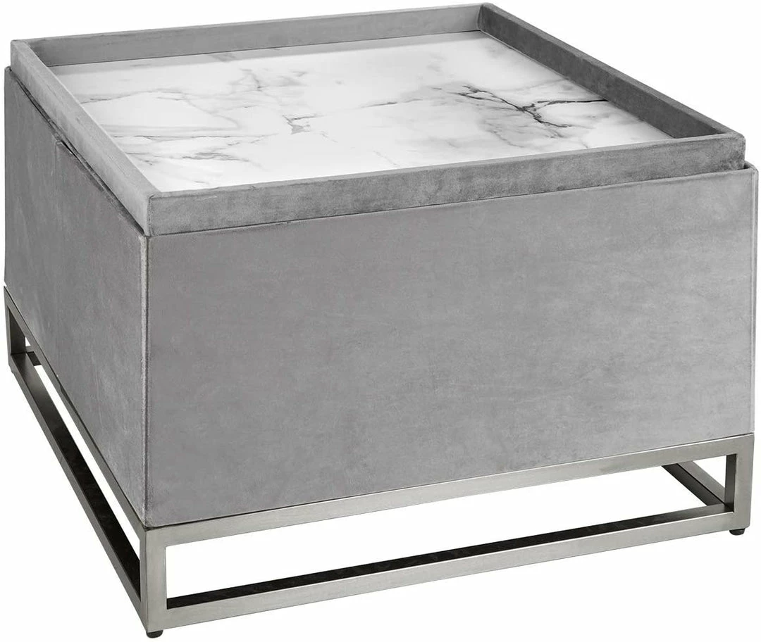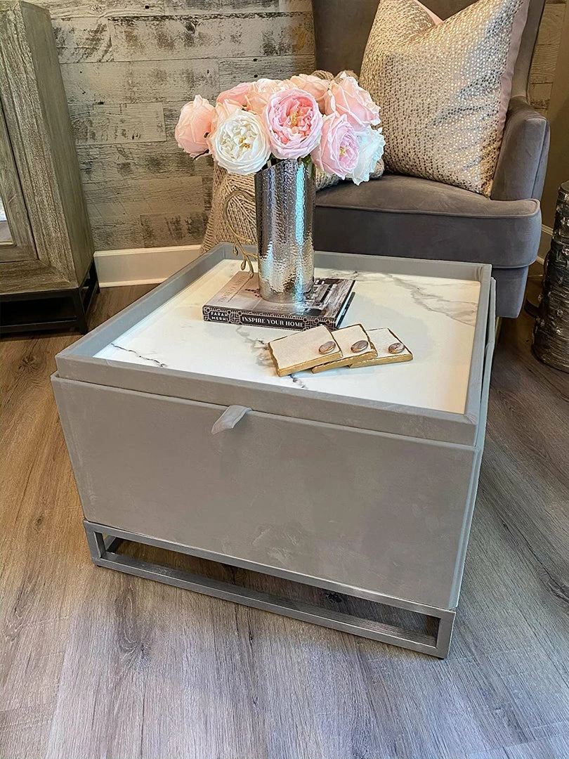 Inspire Me! Home Décor features the Caroline tufted inset lid coffee table ottoman with storage. This soft velvet upholstered ottoman with brass metal frame adds a glamorous look to your living room or bedroom. It gives triple functionality, the lid flips over to reveal a faux marble tray that can be used as a coffee table, there is storage space and it provides seating for your guests.