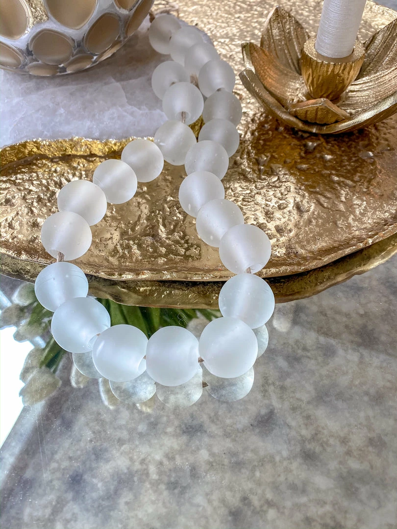 These lovely clear beads are constructed of glass and feature a matte finish. They are perfect to style on a tray with your favorite decorative coffee table books, or with a nice vase.