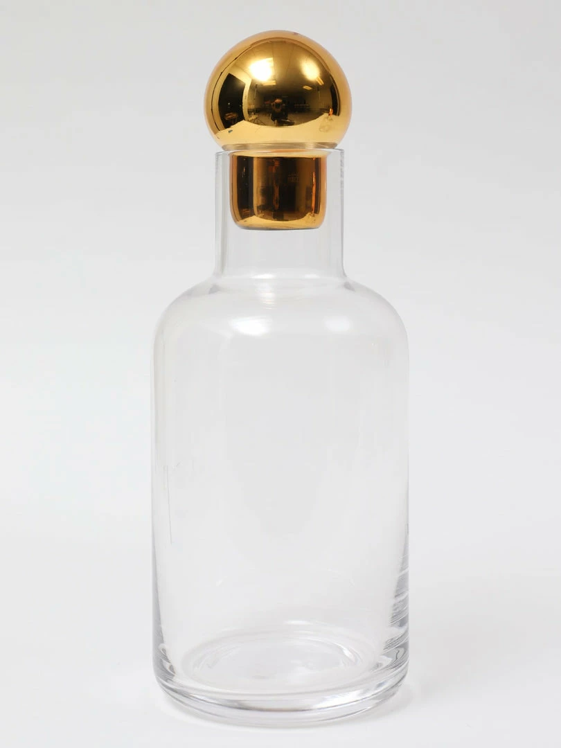Description: This elegant glass decanter is a simple yet stylish piece! Topped with a round gold stopper, this is a simple way to add some glam to a room.