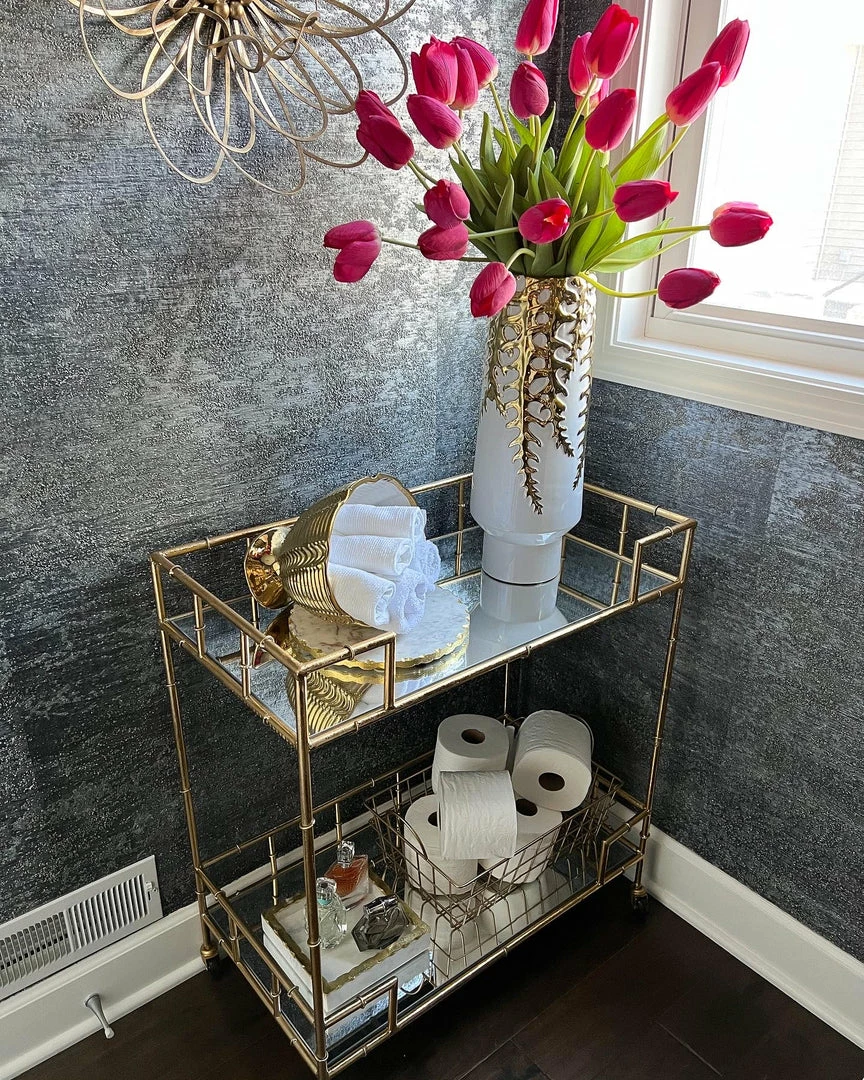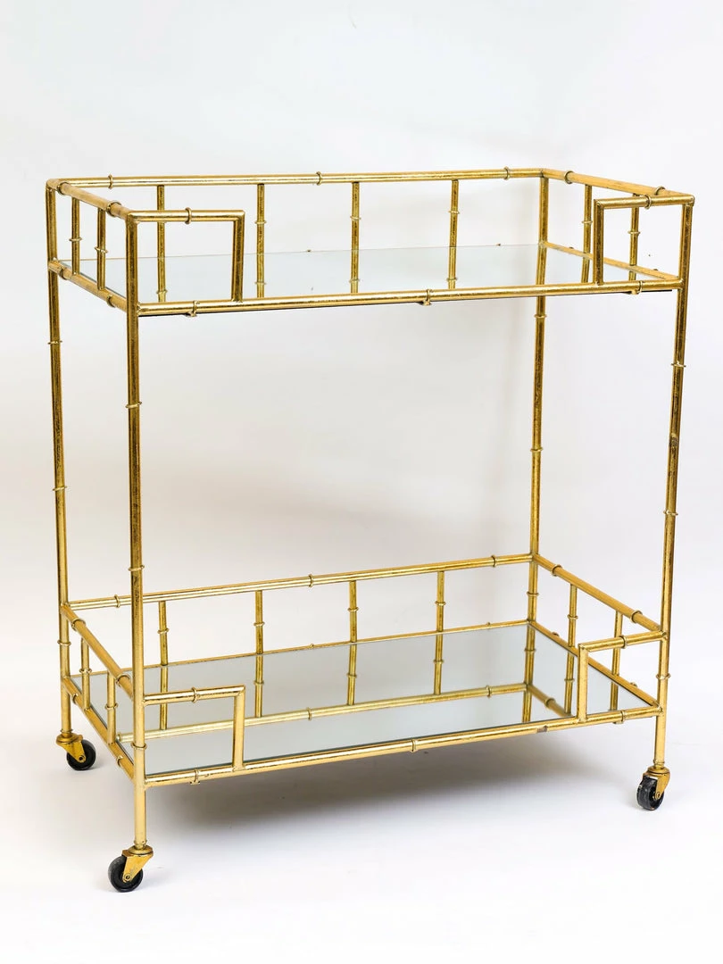 Description: This Metal 2-Tier bar cart features a distressed gold metal finish and mirrored tops. This is perfect to style in your kitchen, restroom, dining room, etc!