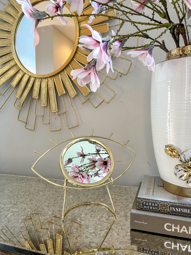 Protect your home from negative energy with this beautiful Gold evil eye mirror on a stand. Comes with the stand.
