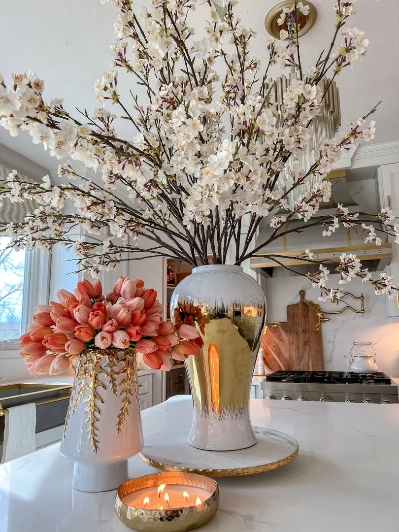 Description: This cherry blossom stem is the perfect accent for your home all year round! This stem is quite substantial and tall. Perfect for a tall vase in an entryway and can be used all year round!