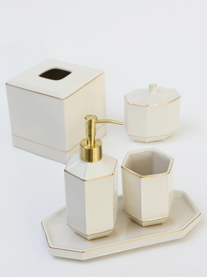 Description: This beautiful geometric bathroom set features a dazzling porcelain finish with gold accents. The perfect accessories for your bathroom or kitchen!