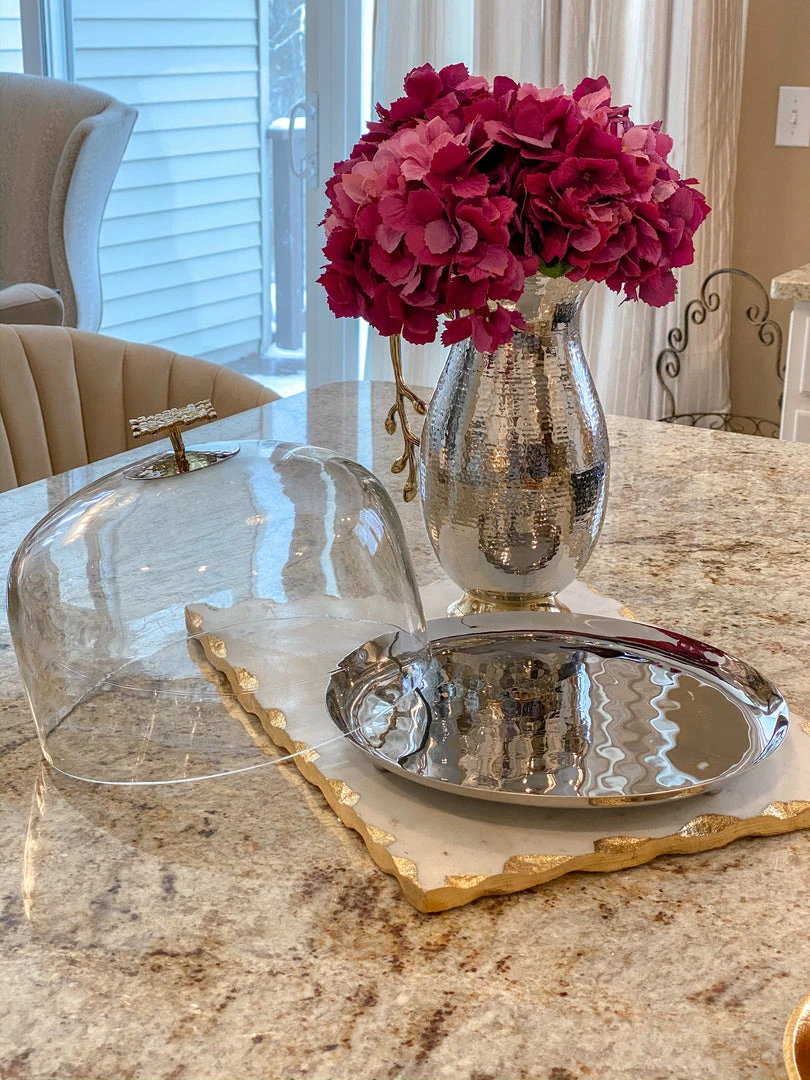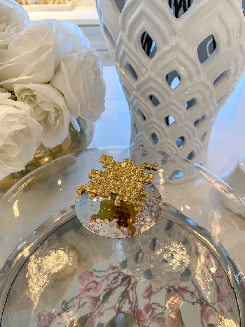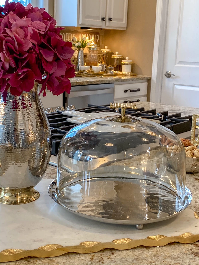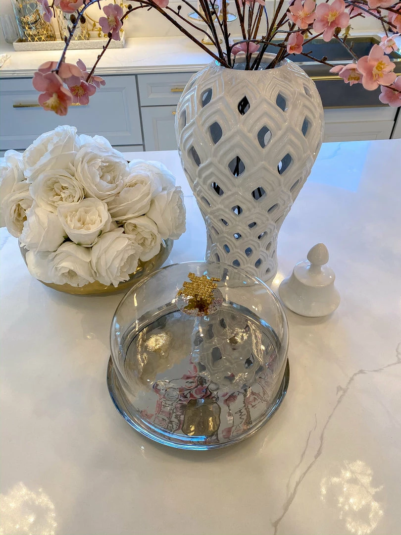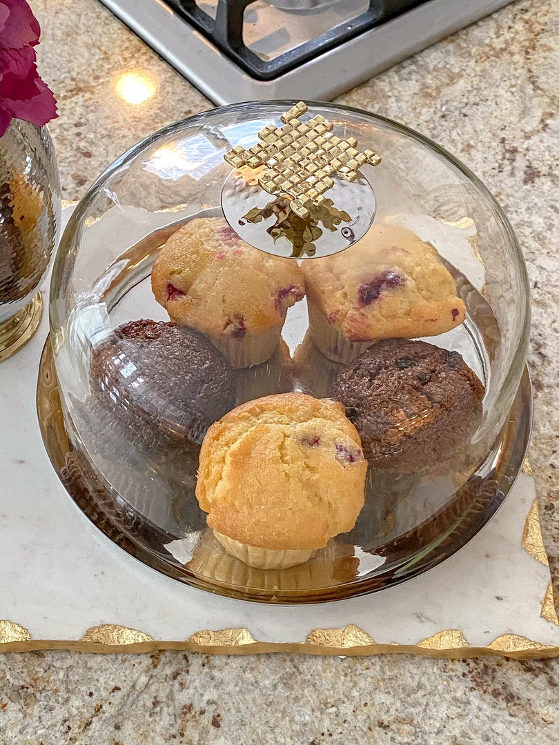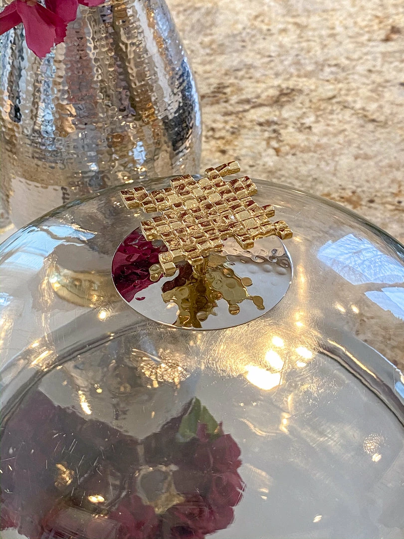 Glass and metal cake dome with gold mosaic handle matches perfectly back to your Hammered Lid Glass canisters along with your other mosaic pieces from the collection.