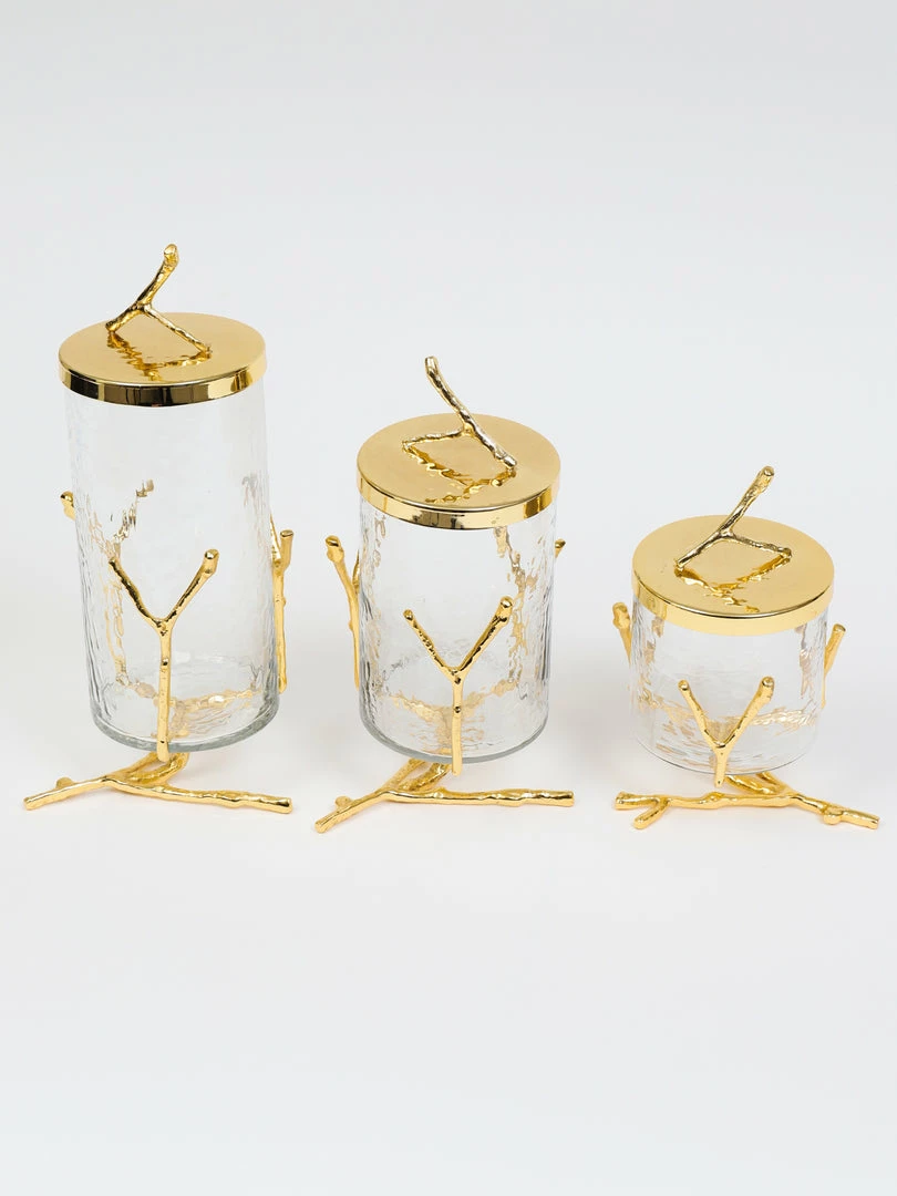 Description: This glass canister with an all-metal lid with branch design also features a gold branch base which will enhance your display. Use it at a coffee station for a glamorous display.