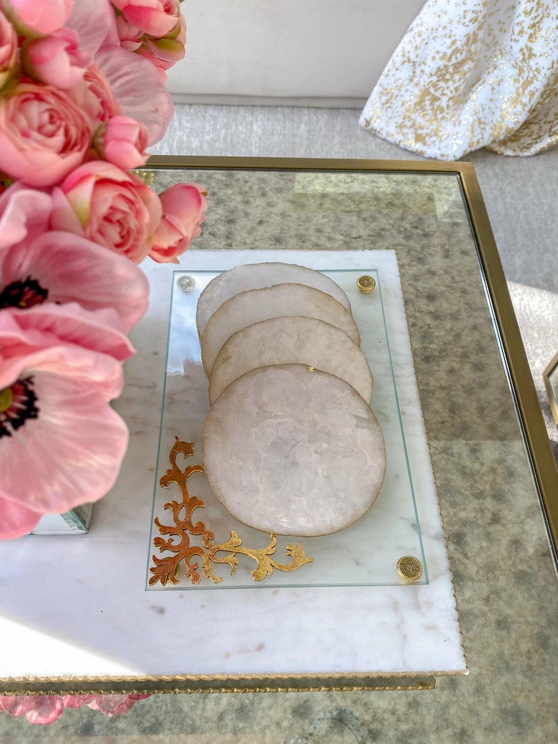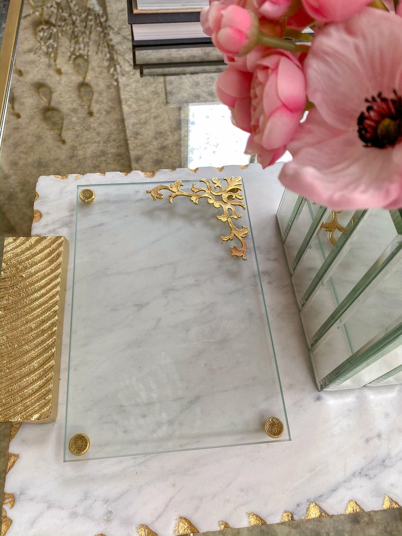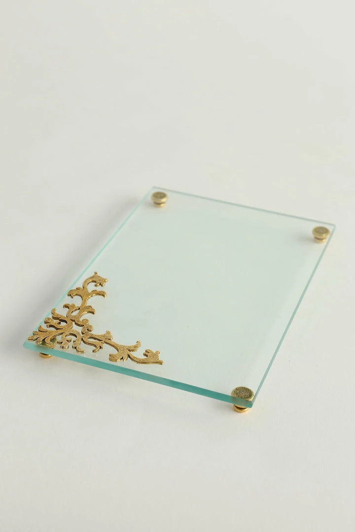 Description: This small and elegant tray is a perfect addition to your home decor! Rectangular glass is accented on the corners by beautiful gold designs that pack so much elegance into a small space!
