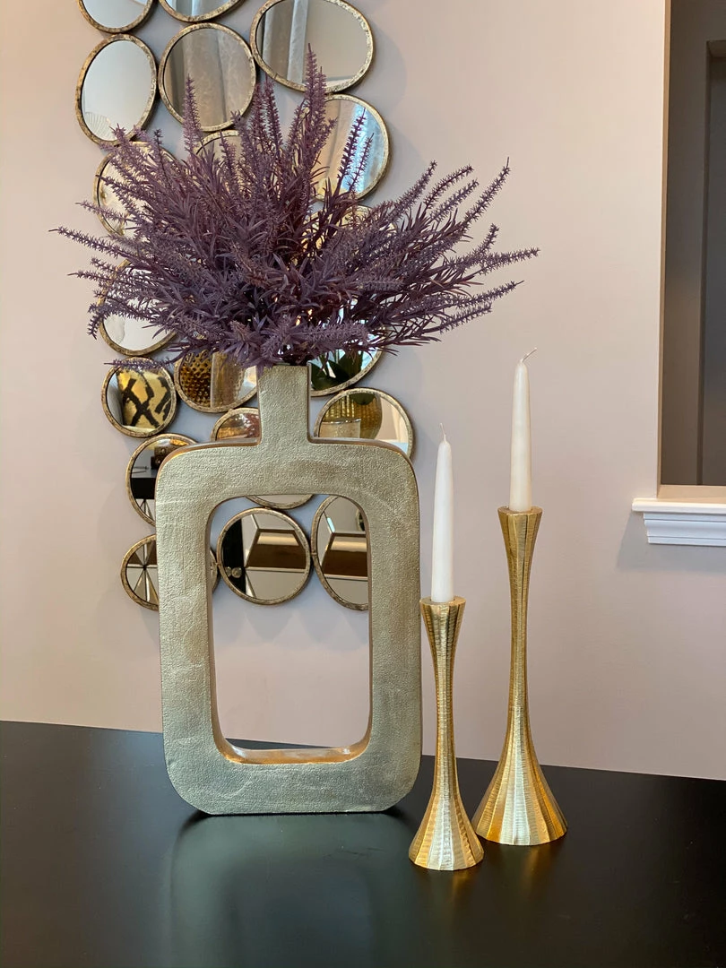 Description:This unique gold vase is the perfect blend of modern and elegance. The unique shape makes it very glamourous, and the sleek design makes it very modern and stylish.