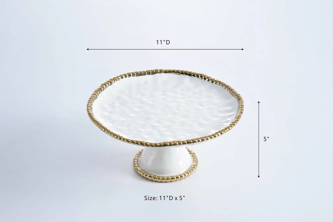Description: This high quality porcelain is a miracle material! It is food safe, dishwasher safe, and oven safe up to 350 degrees! Made in Argentina, this beautiful porcelain is also tarnish free, scratch/stain resistant, will not lose its beautiful luster, and is perfect for everyday life! Baking and serving never looked so good! This beaded cake stand is an elegant and timeless piece that can be used for decor or food! It has a nice shine to it and ties back to all the beaded porcelain pieces.