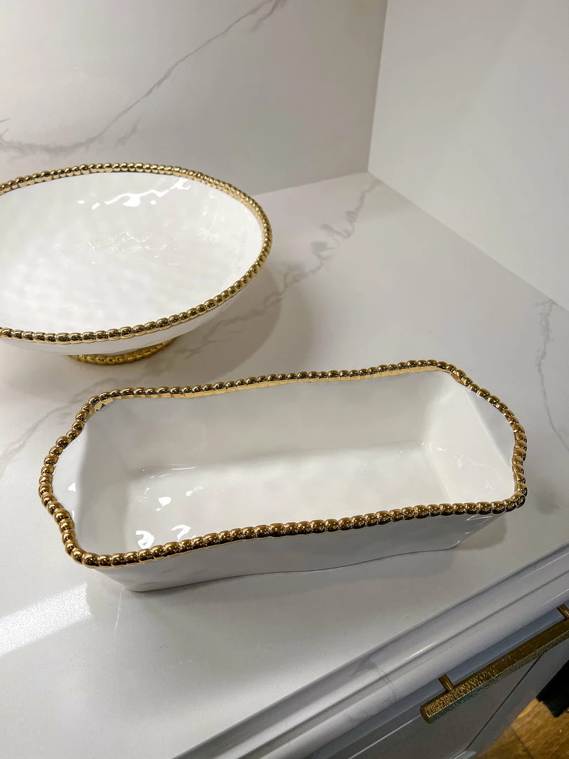 Description: This stylish white porcelain baking dish features a white base and gold beaded trim detail and will make a lovely addition to your decor.Â