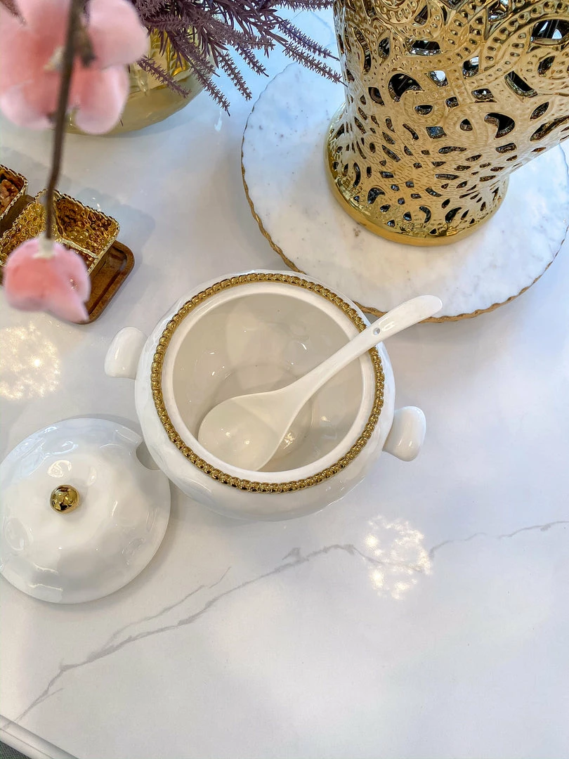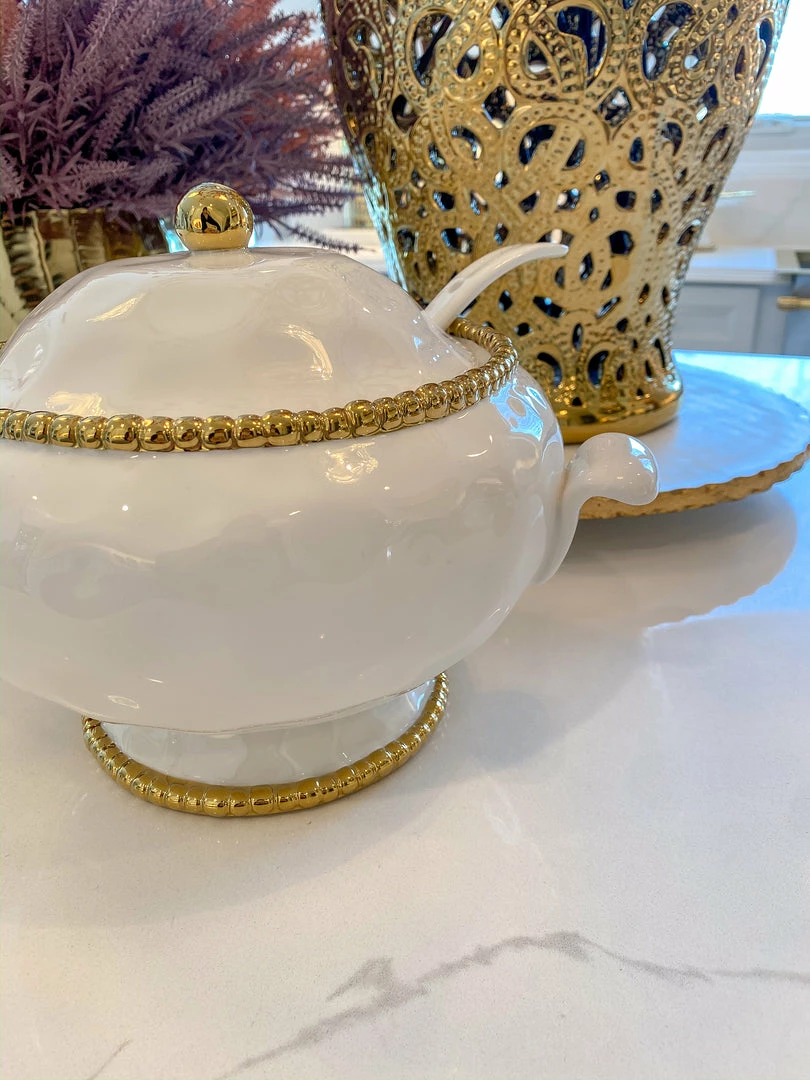 Description: This high quality porcelain is a miracle material! It is food safe, dishwasher safe, and oven safe up to 350 degrees! Made in Argentina, this beautiful porcelain is also tarnish free, scratch/stain resistant, will not lose its beautiful luster, and is perfect for everyday life! Baking and serving never looked so good! This beautiful white textured soup serving bowl with gold beaded trim is a wonderufl addition to your baking and serveware! Food safe and oven safe, this piece is as stunning as it is functional!