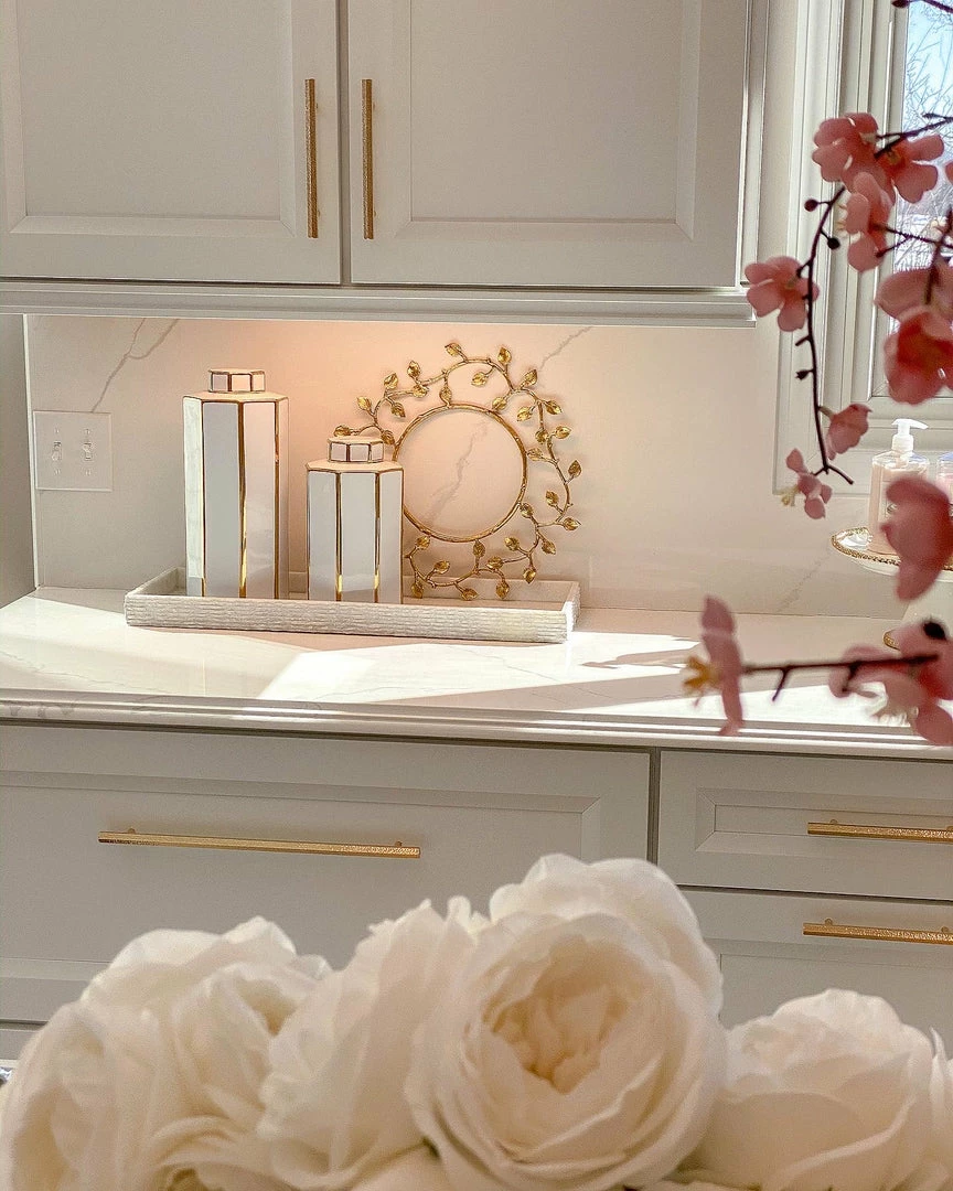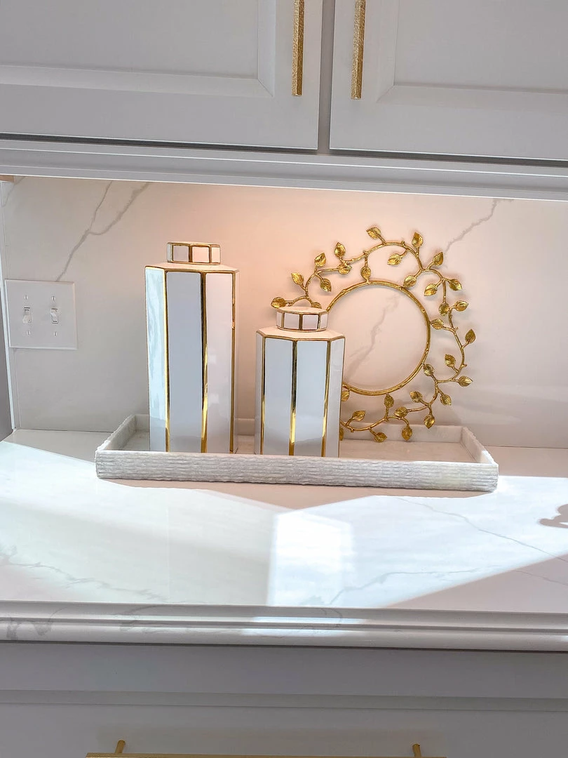 Description: This gold and white jar is a stunning design! The crisp edges make this a modern twist and the glossy gold finish adds a brilliant touch of glam! Available in 2 sizes!