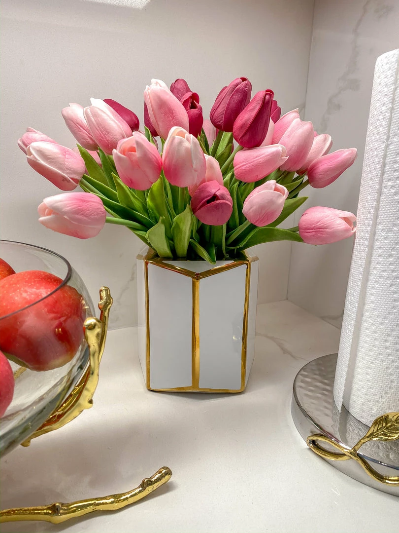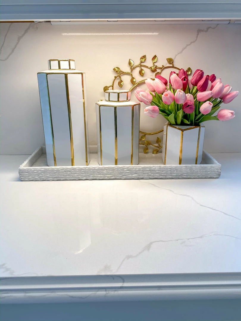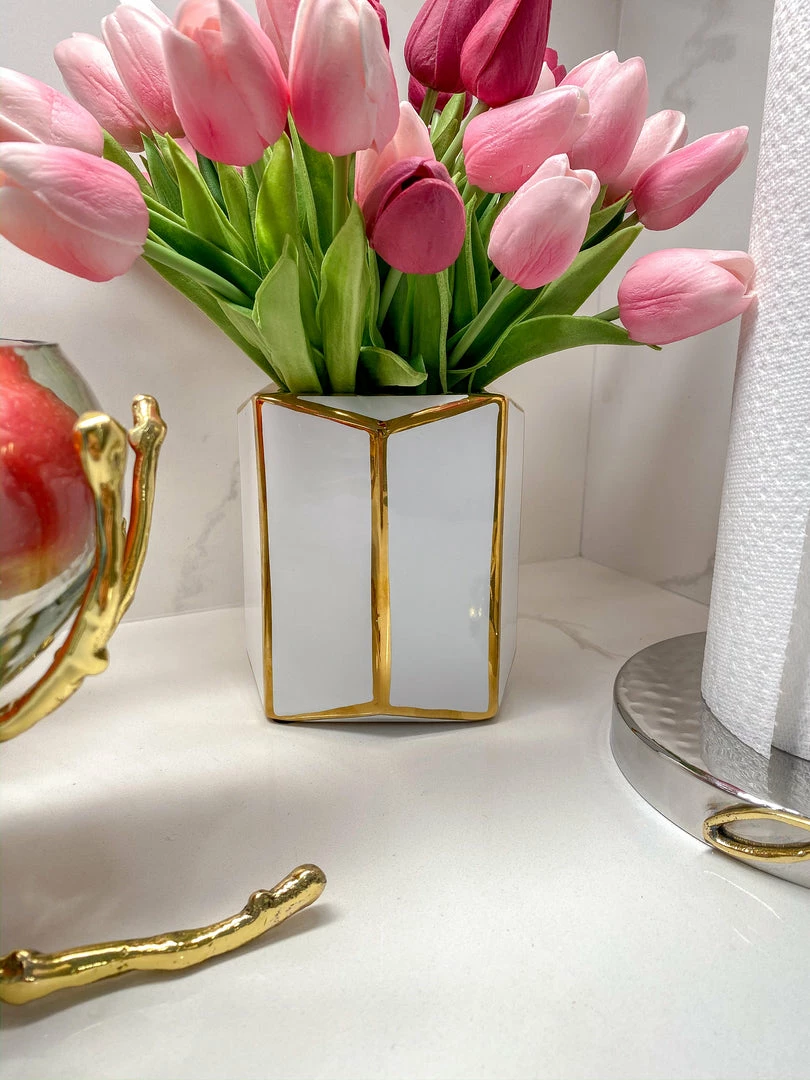 Description: This stunning white octagon vase is highlighted with the gold trim! This beautiful vase is the perfect blend of geometric modern and simple glamour!