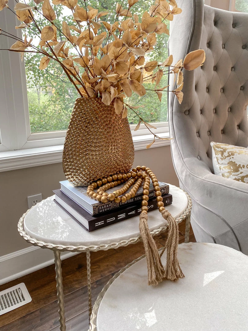 Description: This wooden garland is a very substantial piece and a stunning addition to any tree or bowl for the holidays. we love the beading and how it ties back to our metallic decor!