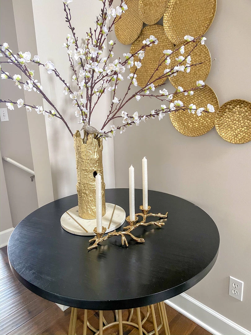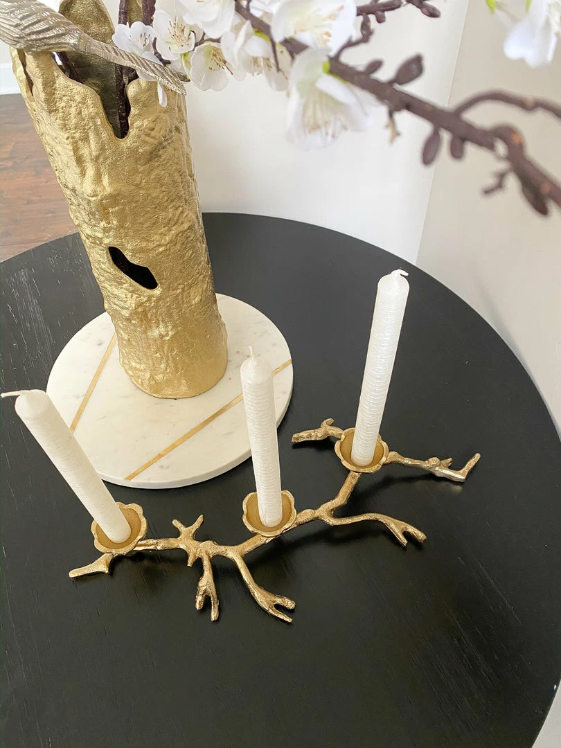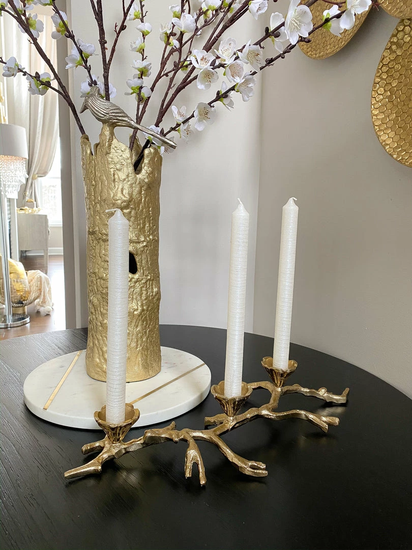 Description: This gold branch candle holder features a very organic look and holds three tapered candles. This is the perfect piece to style on your dining table or coffee table.