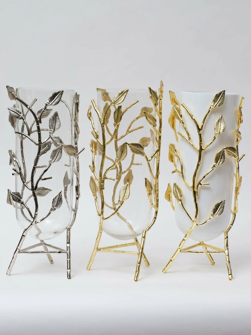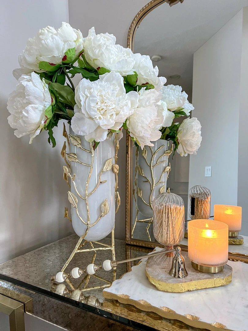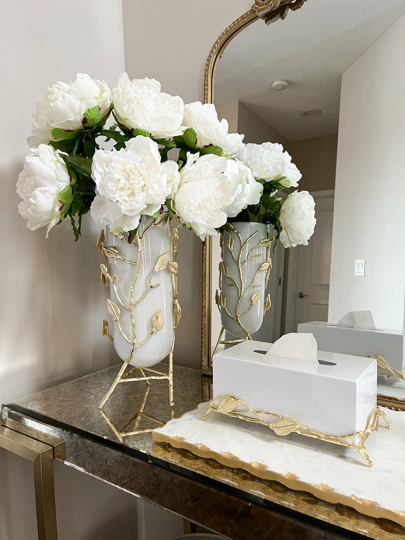 Description: This stunning vase features an opaque white glass vase and an intricate gold base! This vase will hold your favorite faux florals in style.
