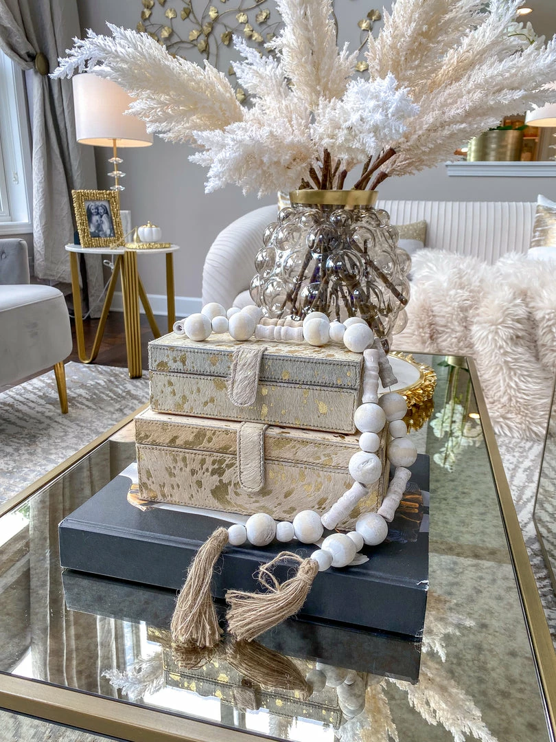Description: Keep your storage in style with this beautiful set of 2 glass boxes! Featuring a faux fur design with an abstract gold pattern!