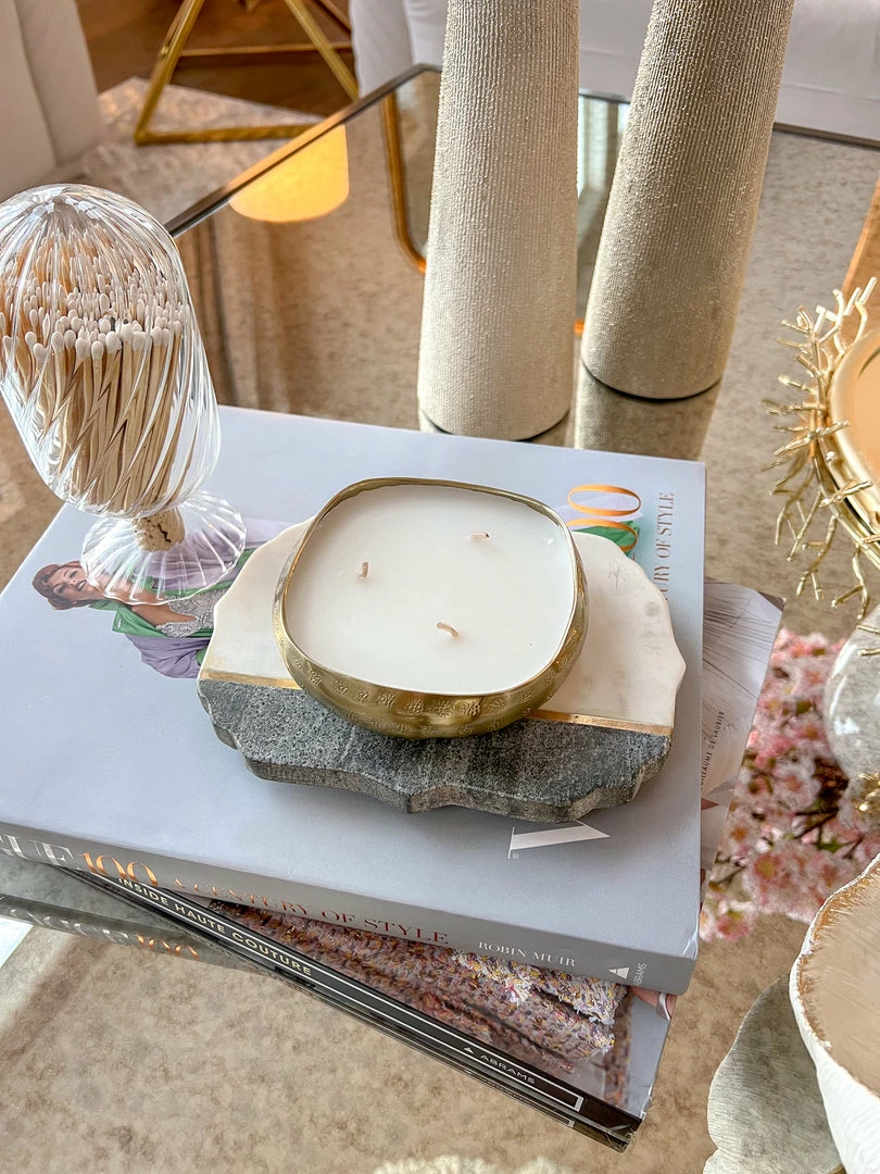 Description: This beautiful gold candle tray is available in 2 sizes. This is a serene Cashmere scented organic soy candle. Burn time is 30 hours for the small 3 wick and 16 hours for the large 6 wick.