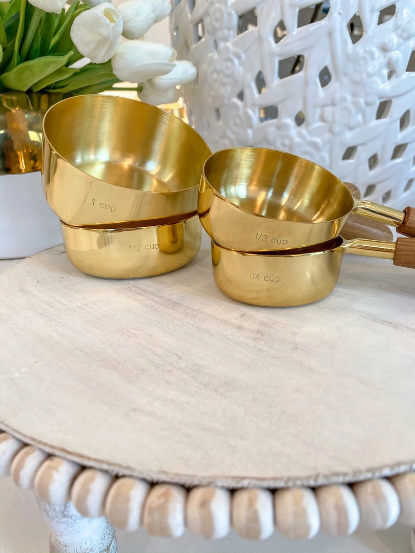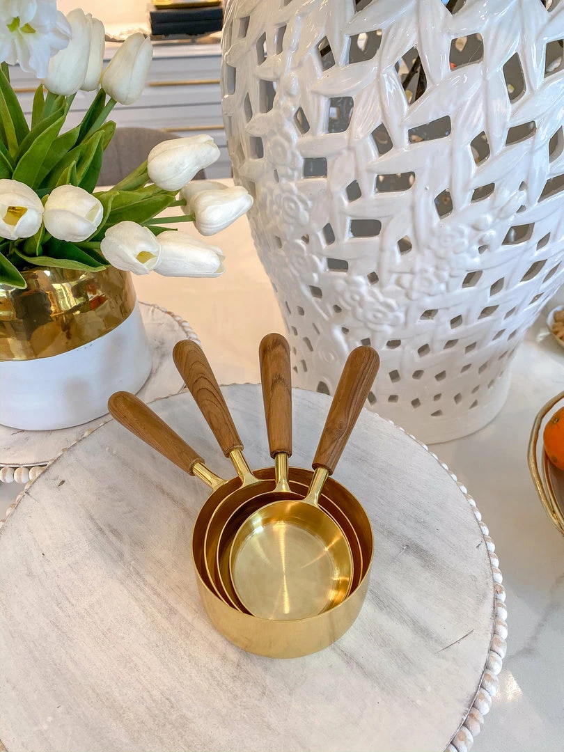 Description: Perfectly measured up for some great style! These set of 4 measuring cups are finished with a gold cup and wooden handle. Extra elegance served up in the kitchen!