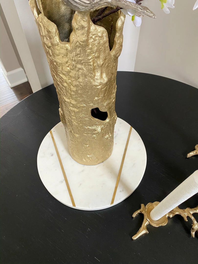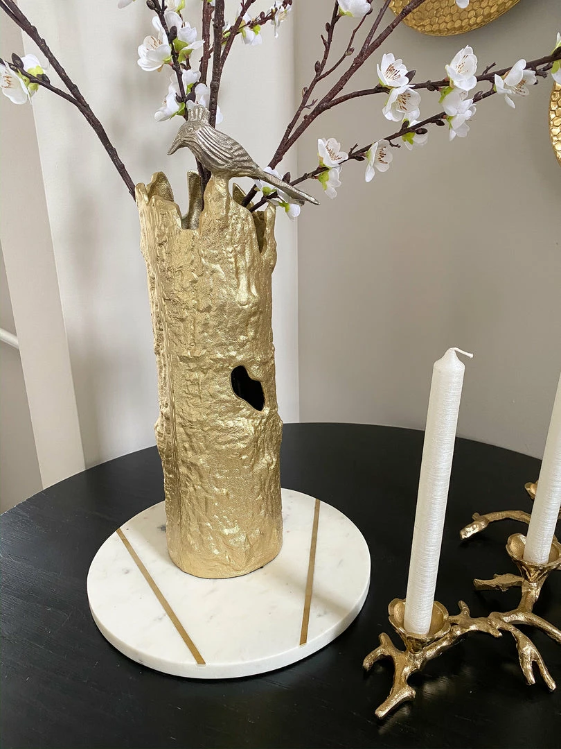 Description: This gold metal “tree” vase features a bark-like gold finish and a small silver bird. It is a great way to introduce some nature into your decor!