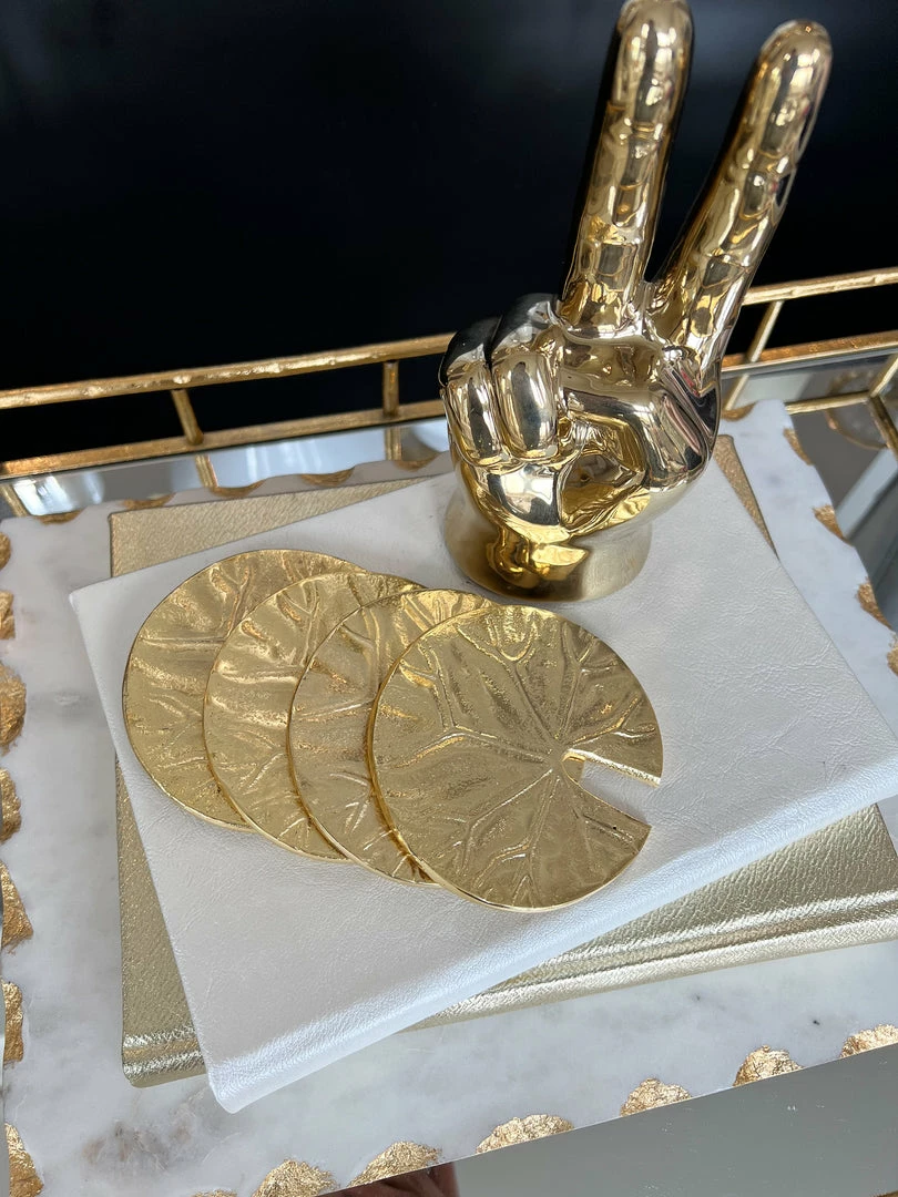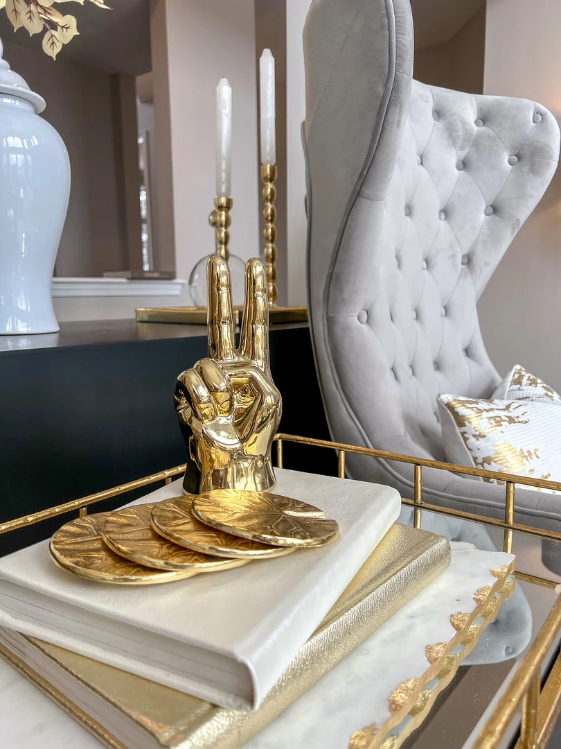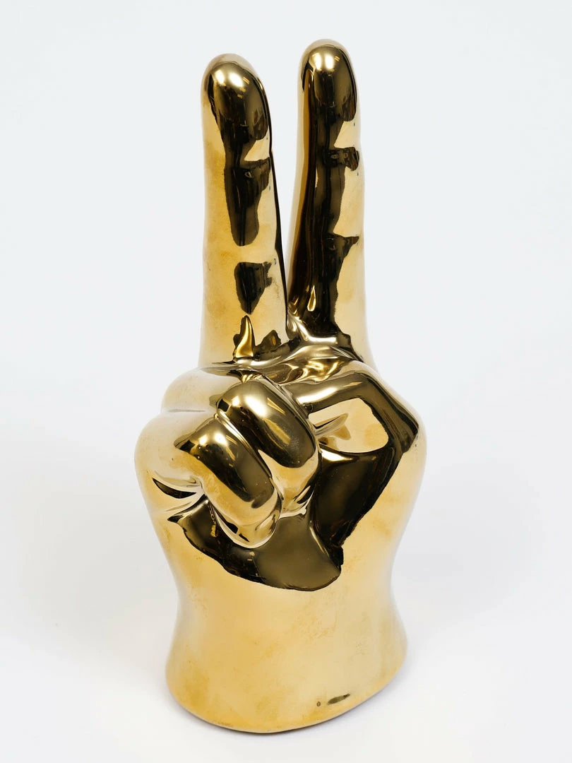 Description: This gold decorative peace sign is perfect for a shelf, desk, or coffee table! We love the quirky design with the glam finish!