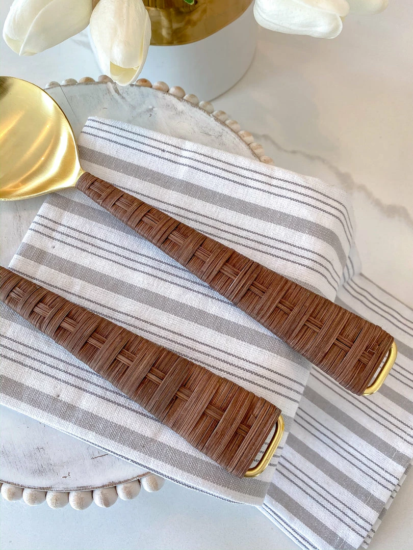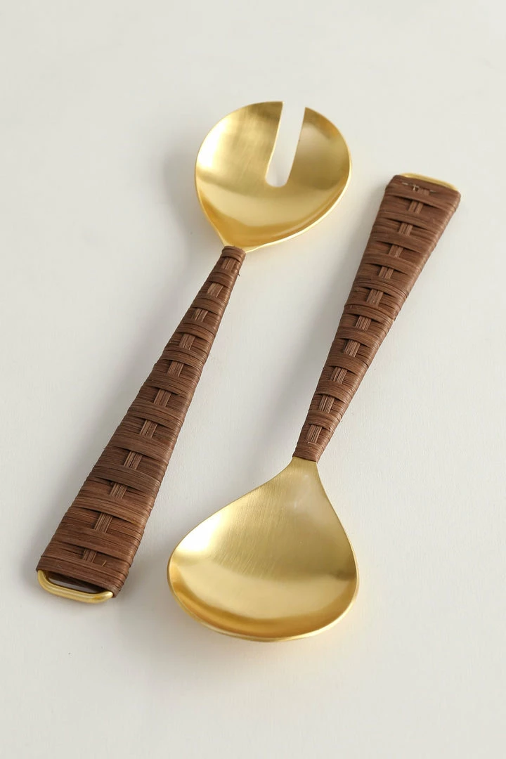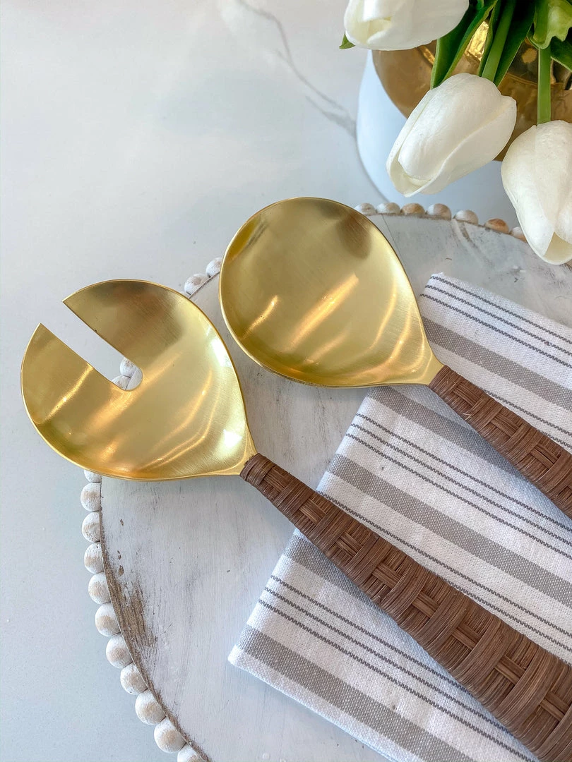 Description: This gold servers beautiful a stylish woven rattan handle. This is a simple and elegant piece that will be a great addition to your kitche decor!
