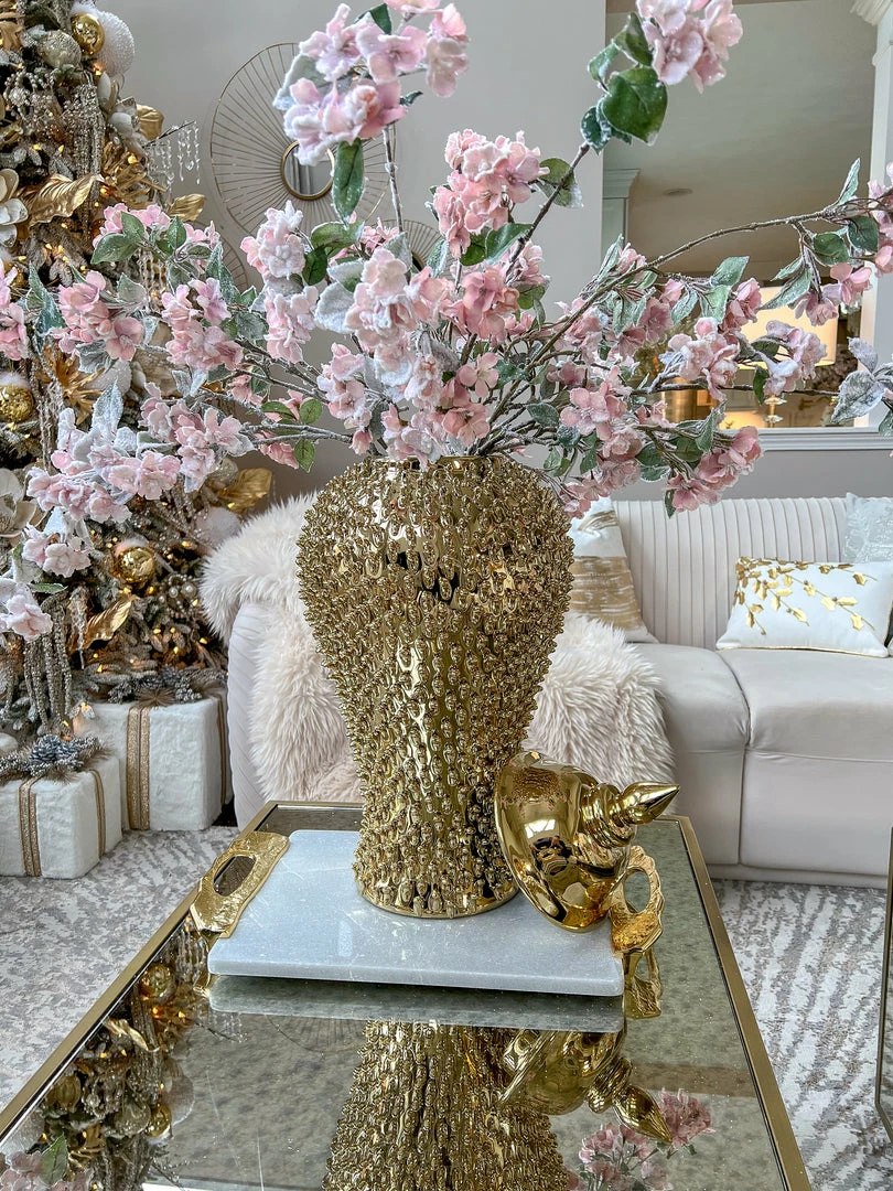 Description: This studded gold ginger jar has the perfect texture to fill your space. Comes in 3 different sizes and has an original beauty that is timeless and elegant.