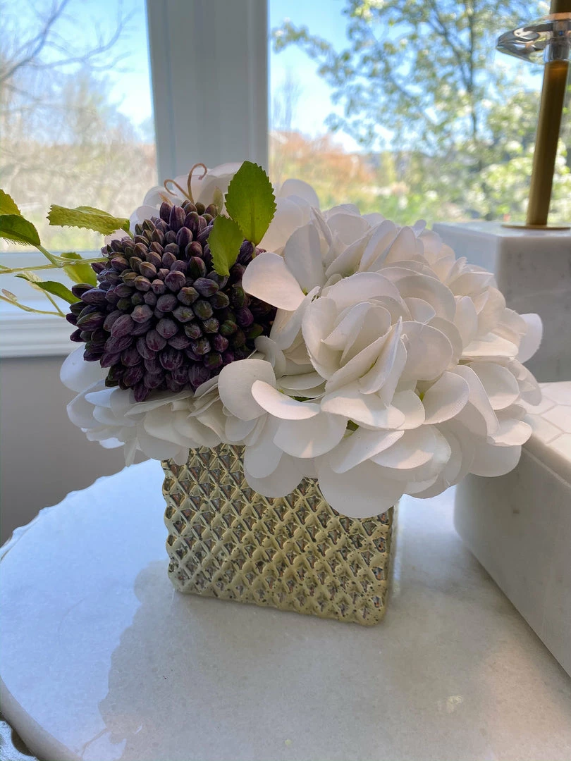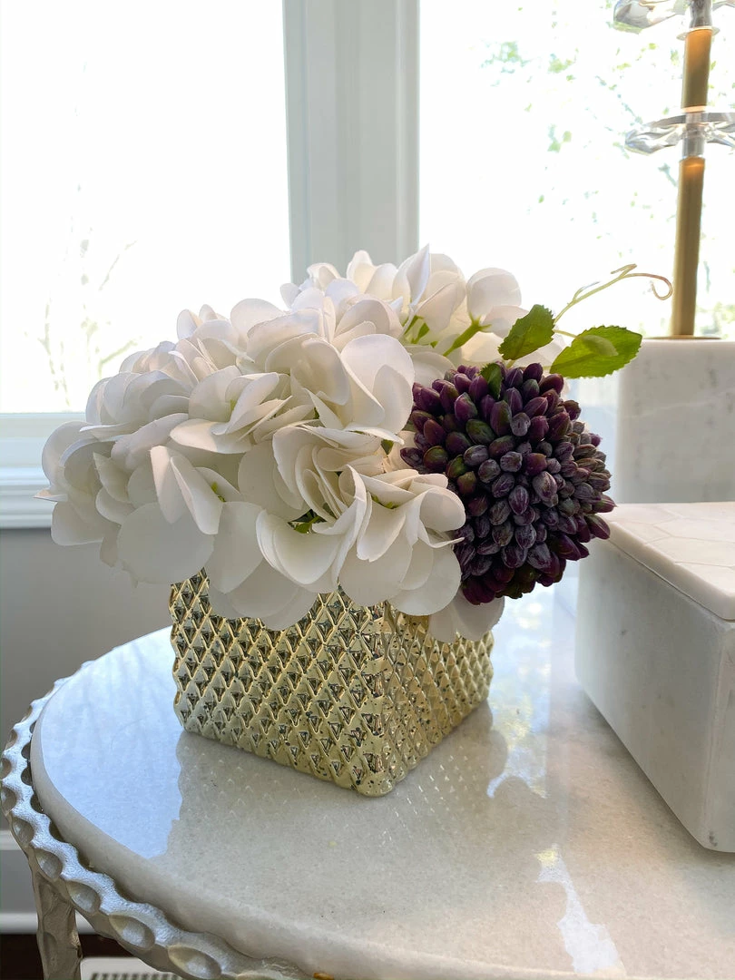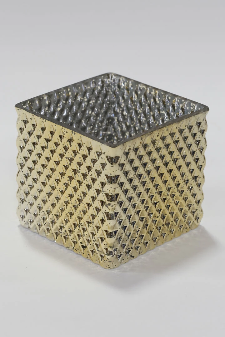 Description: This squared vase will make a perfect addition to small floral arrangement! The shiny gold finish and studded texture add to the supreme elegance of this piece!