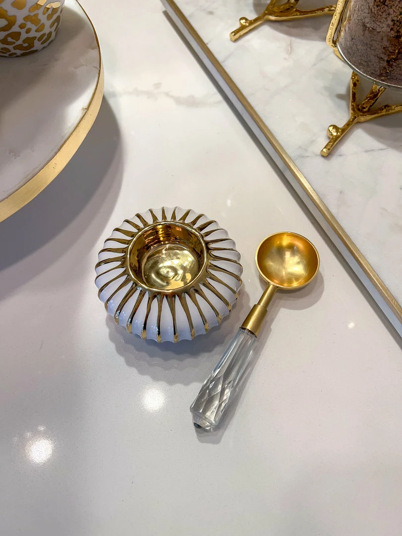 Description: This stunning gold and white teal light holder makes the perfect spoon rest, it can also be used to hold your rings. It is sure to fit into any decor!