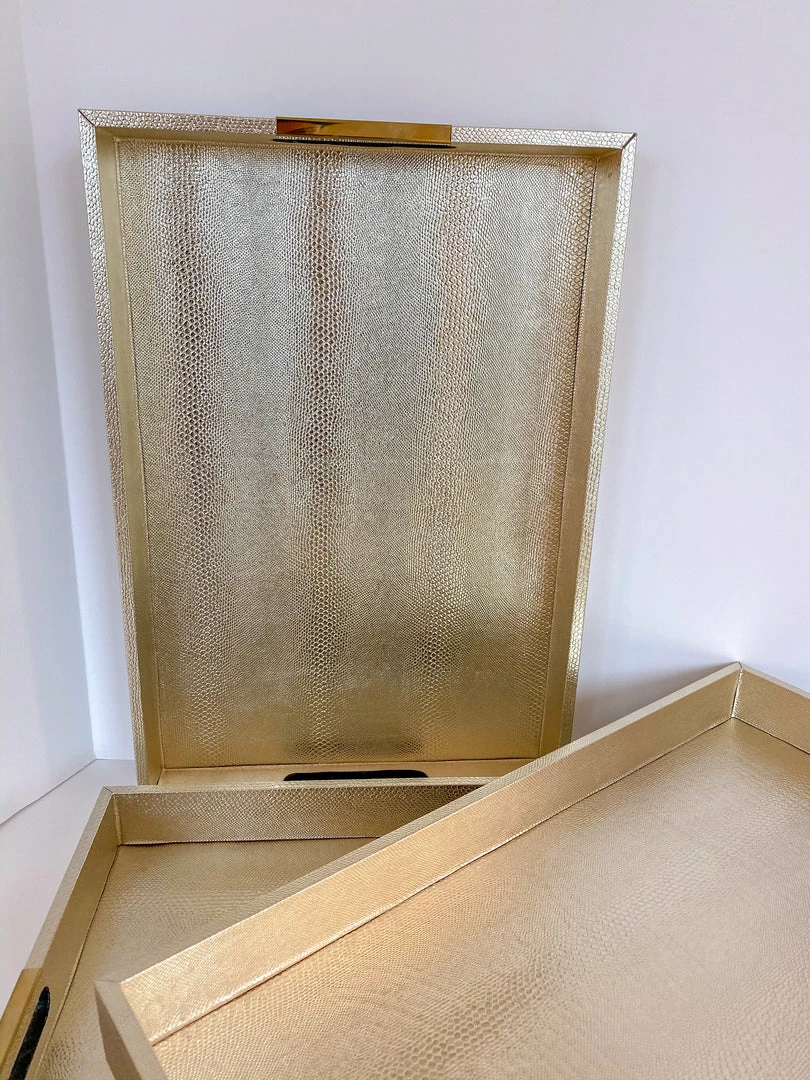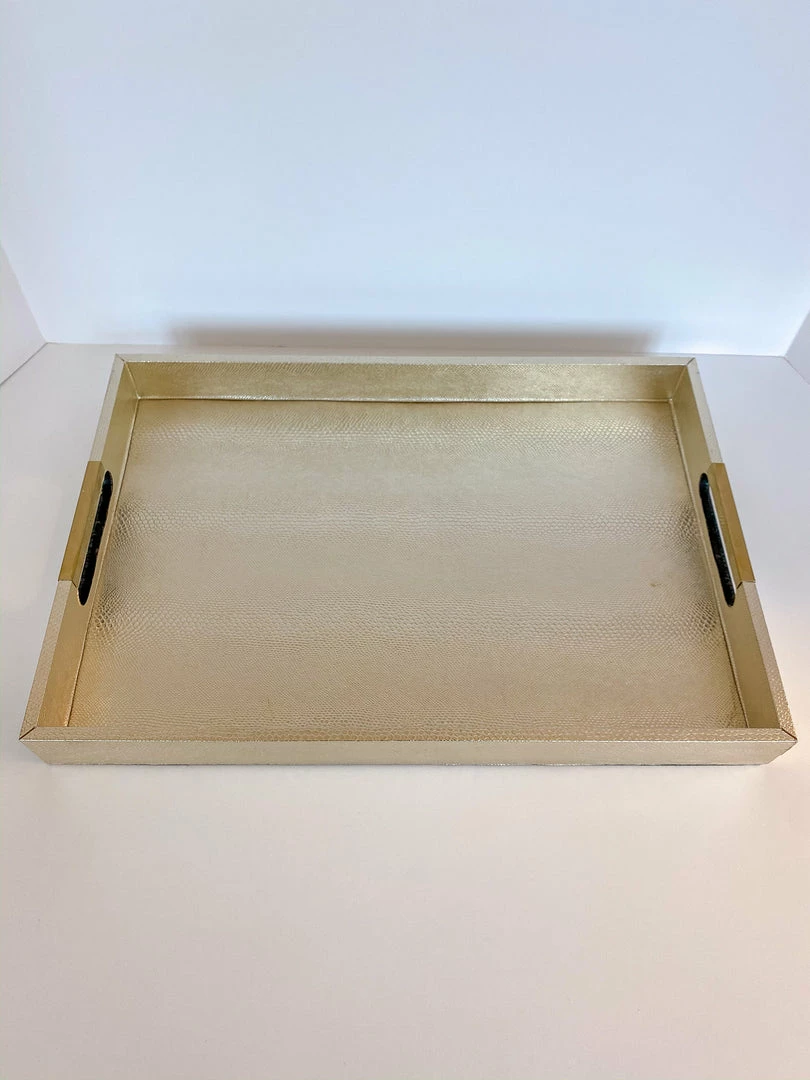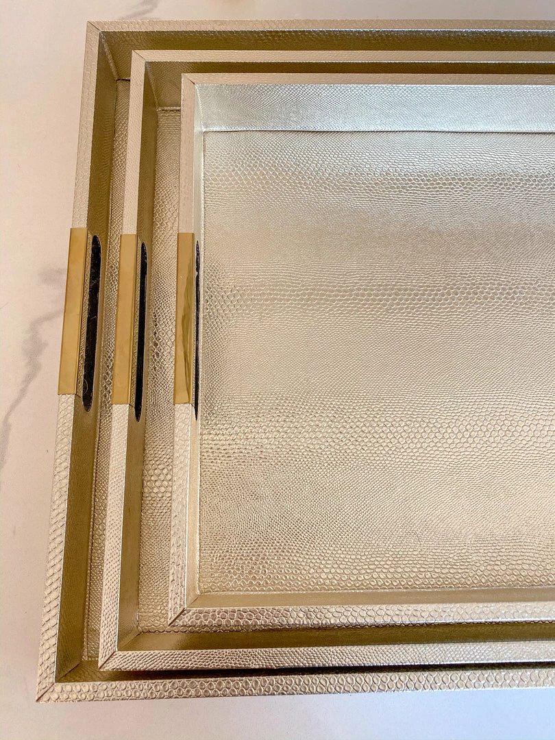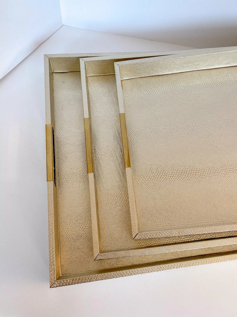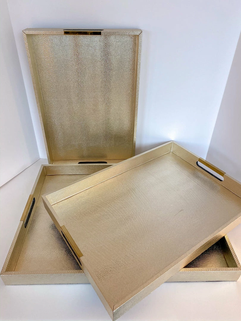 Description: Enjoy sophisticated elegance with this set of 3 golden trays! Each tray is a wood base with metallic gold snakeskin pattern over top for an elegant and fierce finish.