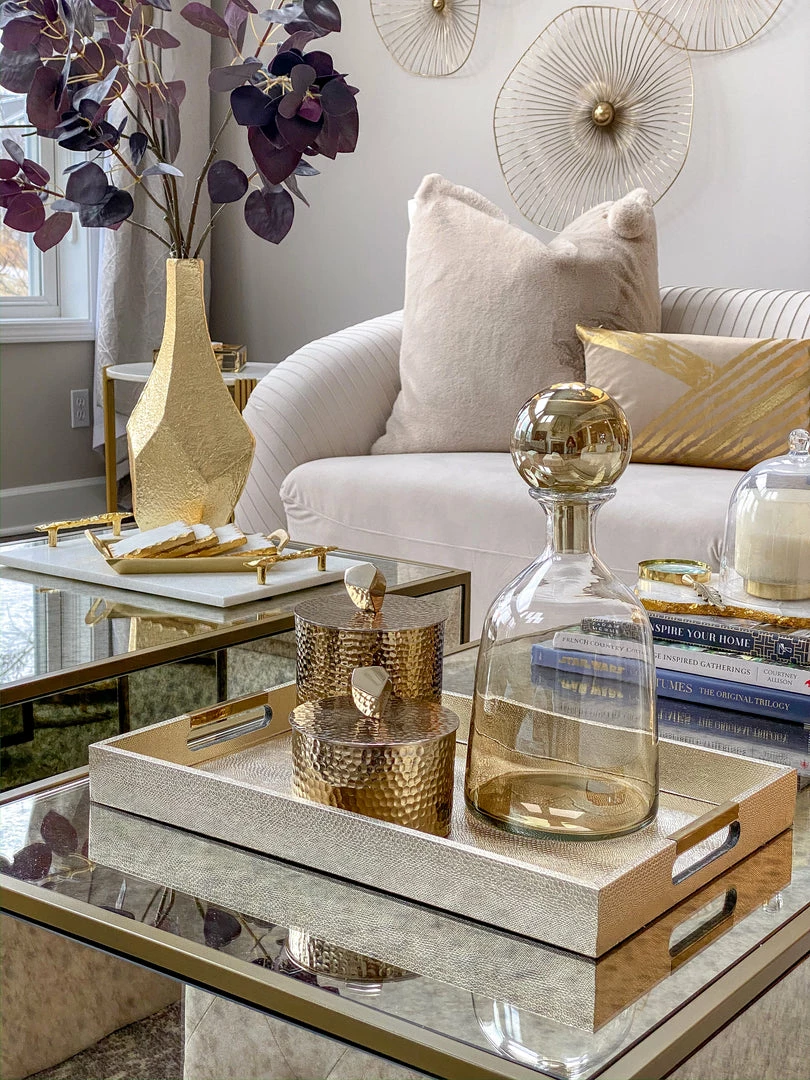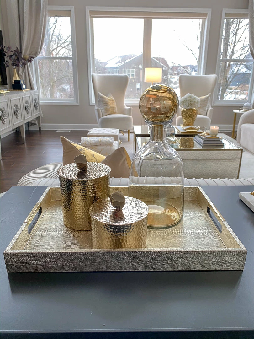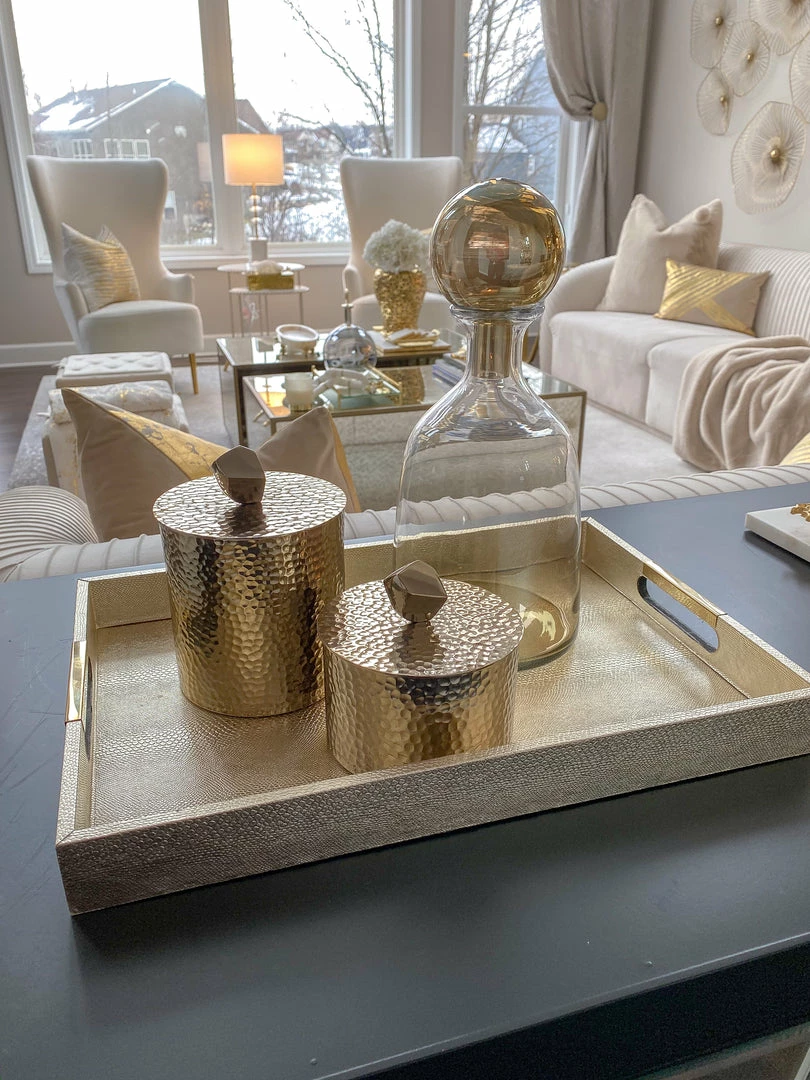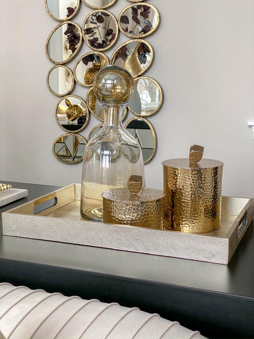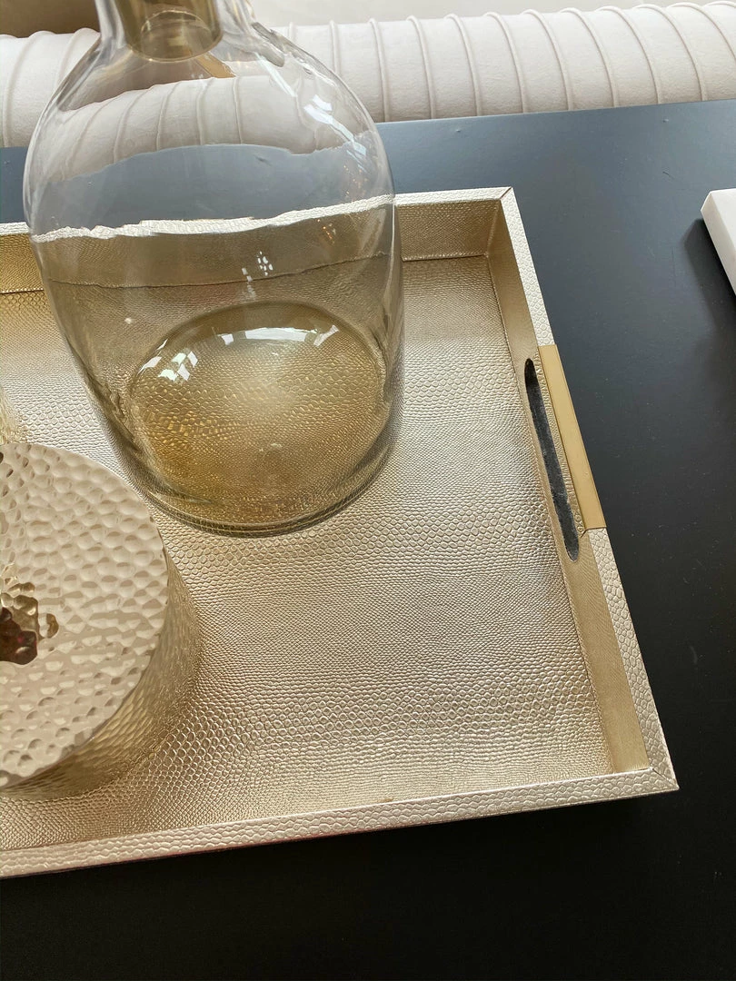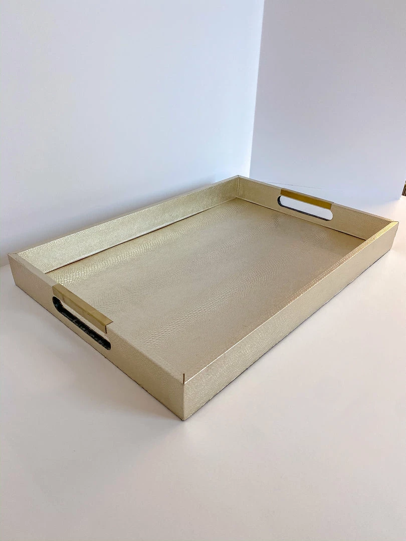 Description: Enjoy sophisticated elegance with this set of 3 golden trays! Each tray is a wood base with metallic gold snakeskin pattern over top for an elegant and fierce finish.
