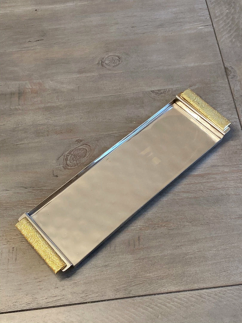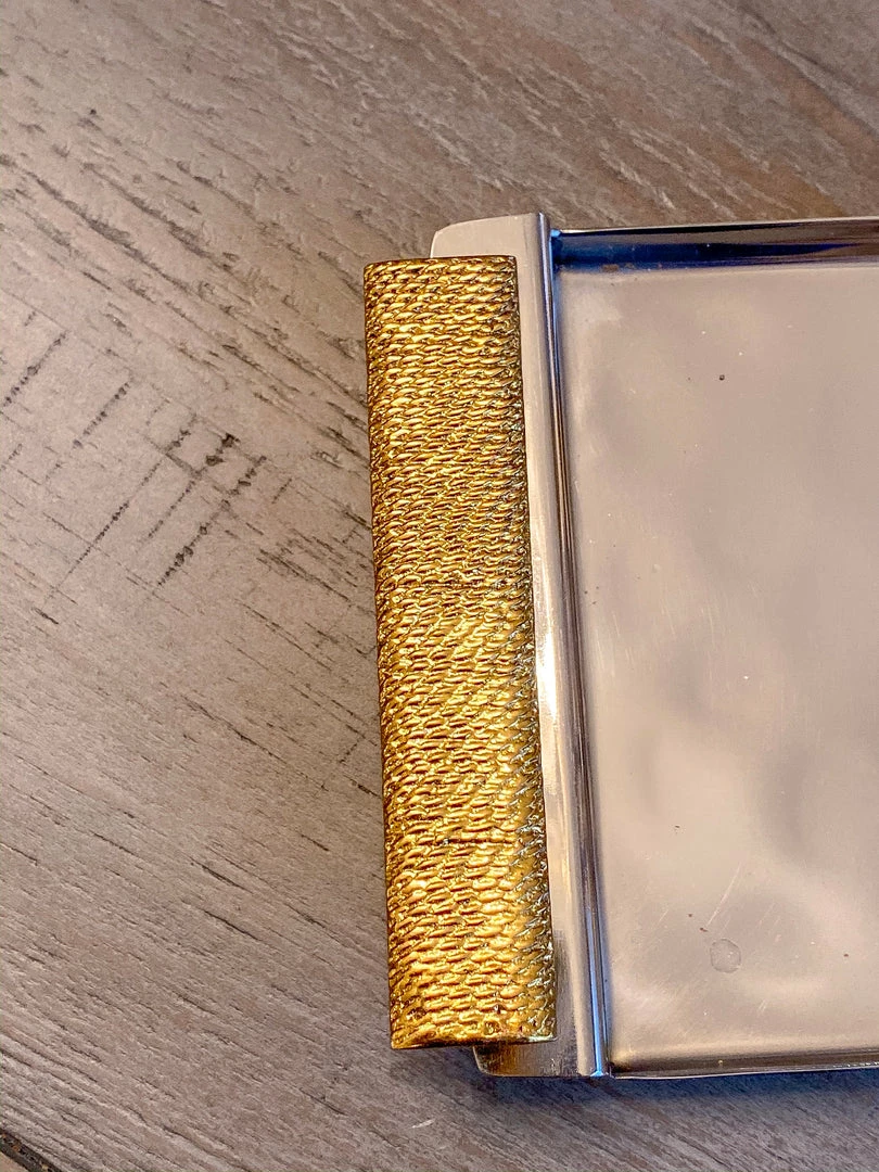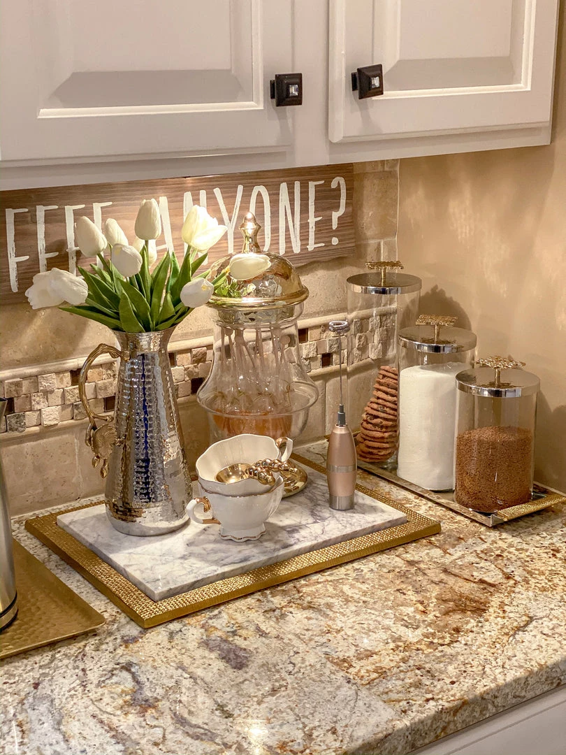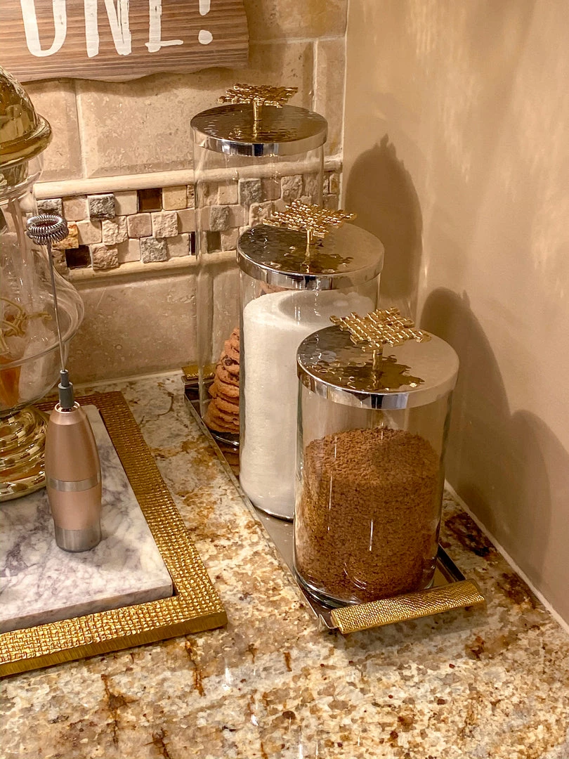 Gorgeous tray accented with gold handles. Pairs beautifully with a set of canisters for a timeless classic look!