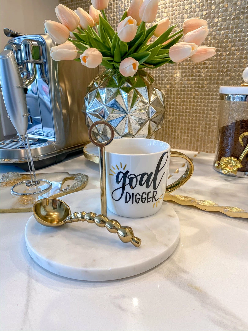 Description: This adorable serving tray is perfect for your coffee station! Use to display your mugs and spices, or just to add an elegant elment of glam!
