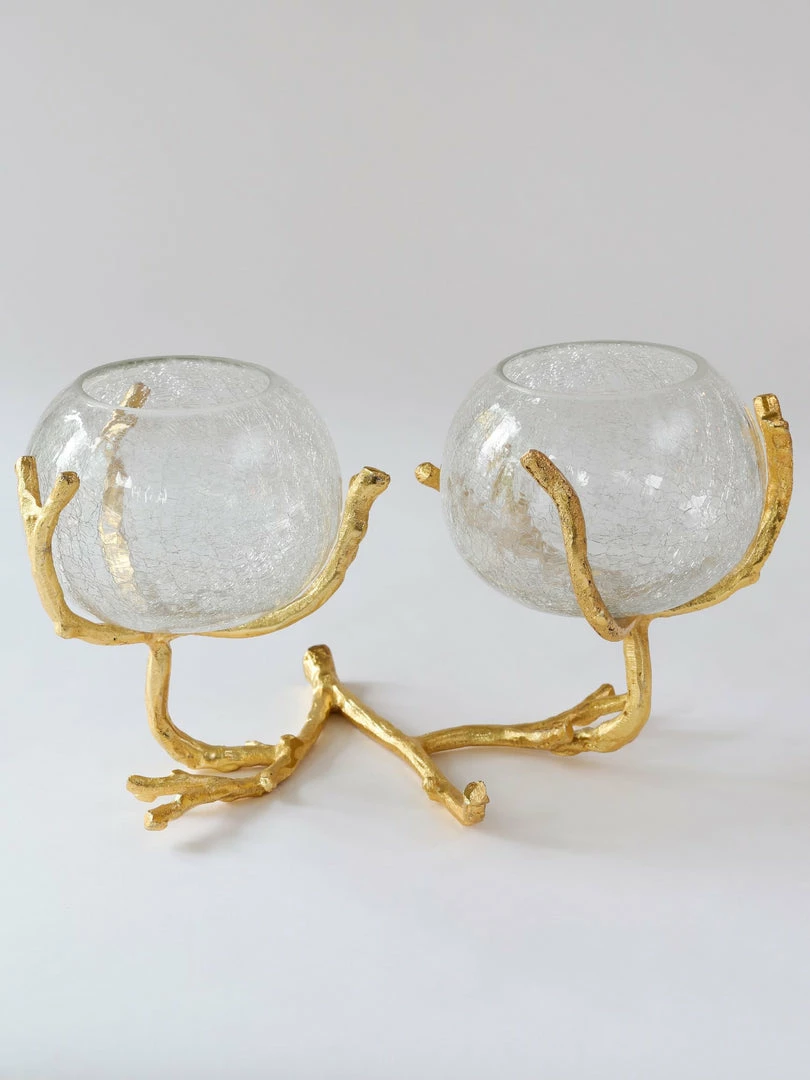 Description: This beautiful vases is sure to add some delight and whimsy into your home! Elegant and stylist, this metal branch stands rests with a large shattered glass bowl to perfectly capture the light of your favorite candles or beautiful floral arrangements!
