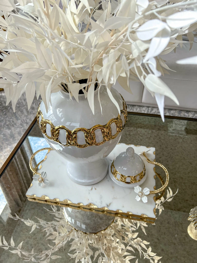 Description: This beautiful rectangular marble tray has stunning gold details with a white jeweled flower design!