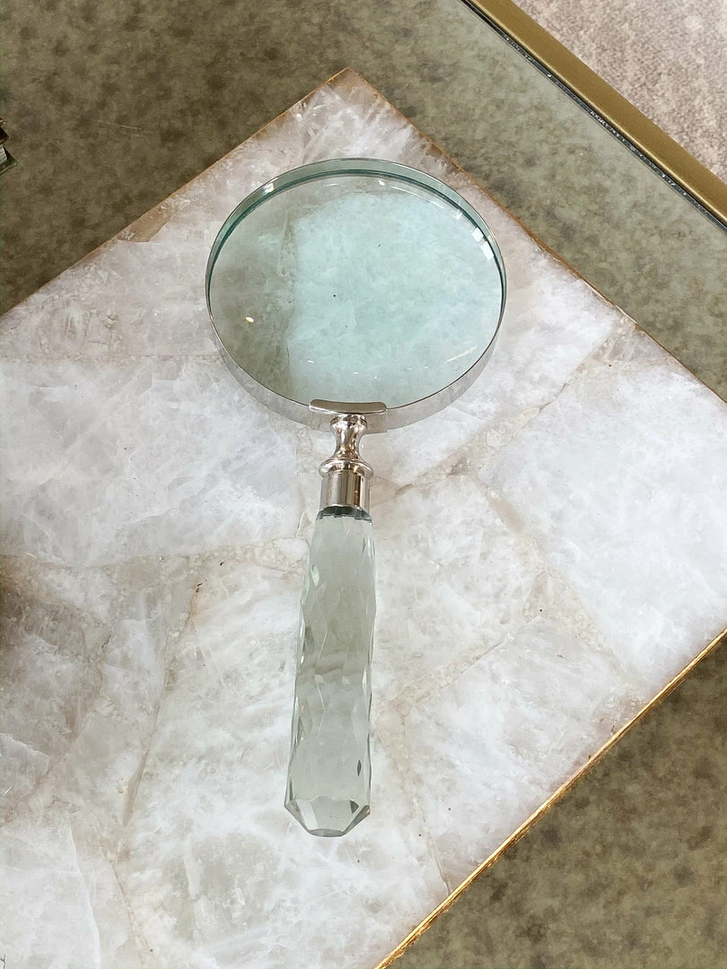 Description: This silver magnifying glass with glass handle adds glamour to your display.