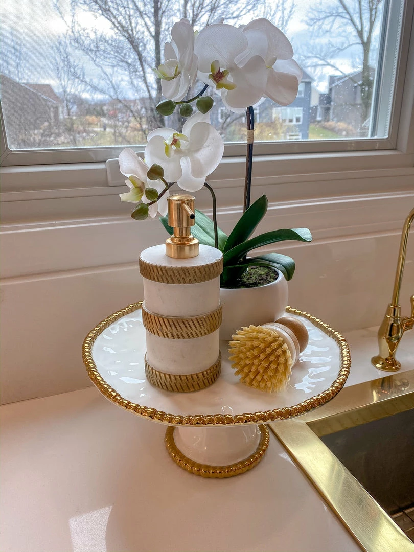 Description: This marble soap dispenser features a gold pattern that is stunning. This will take your kitchen or bathroom to the next level!