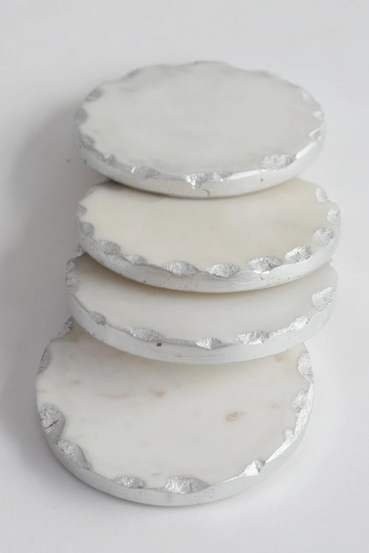 Description: These beautiful marble coasters are a perfect accent for your coffee table! Complete with a hammered texture edge and a metallic finish!