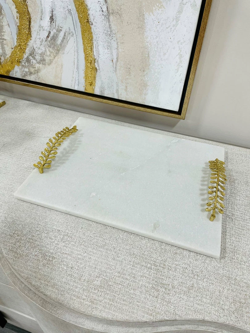 Description: This substantial marble tray features beautiful metal handles with a unique vine pattern.