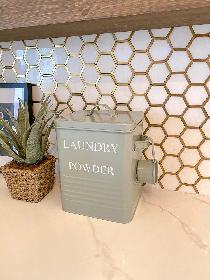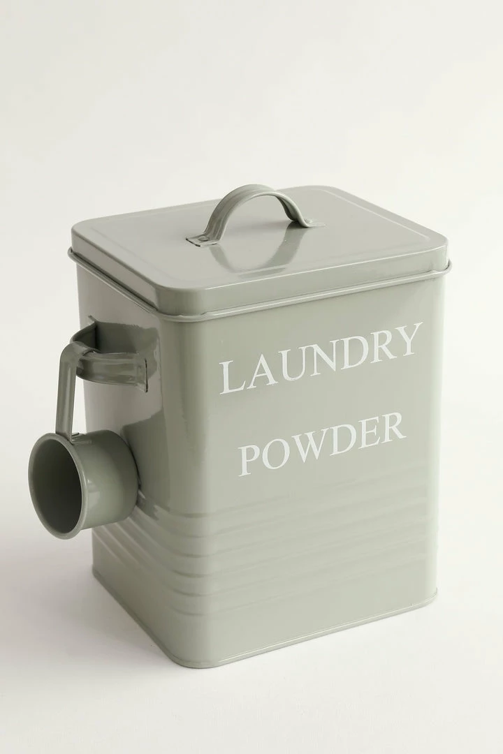 Description: This metal laundry powder bin is a cute addition to your laundry or mudroom.