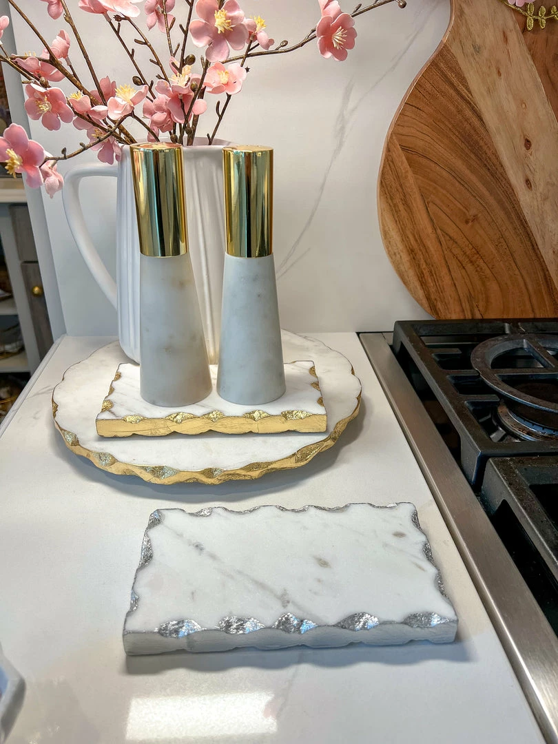 Description: This mini rectangular tray/trivet is just the perfect size for a candle and snuffer!