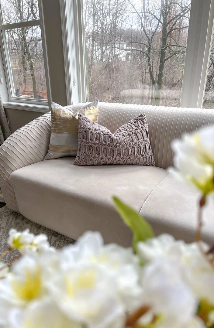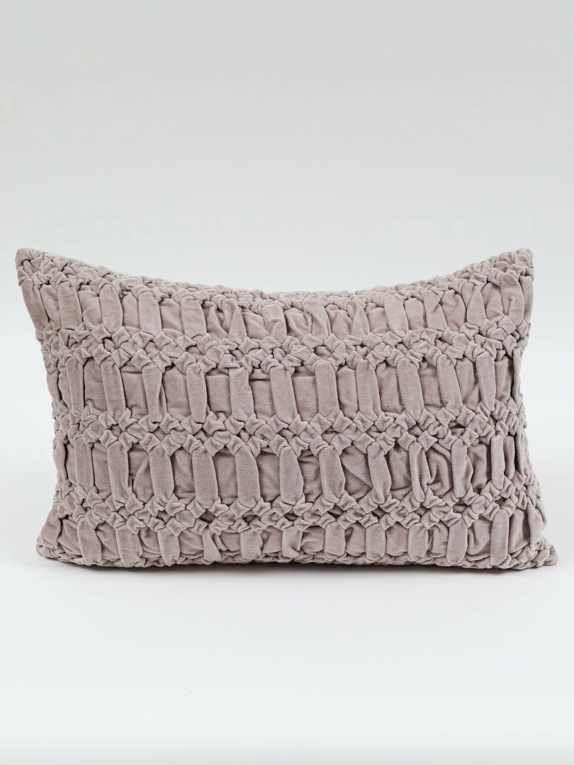 Description: This neutral tone pillow features a muted pink color to add the slightest pop, and a luxurious velvet look!