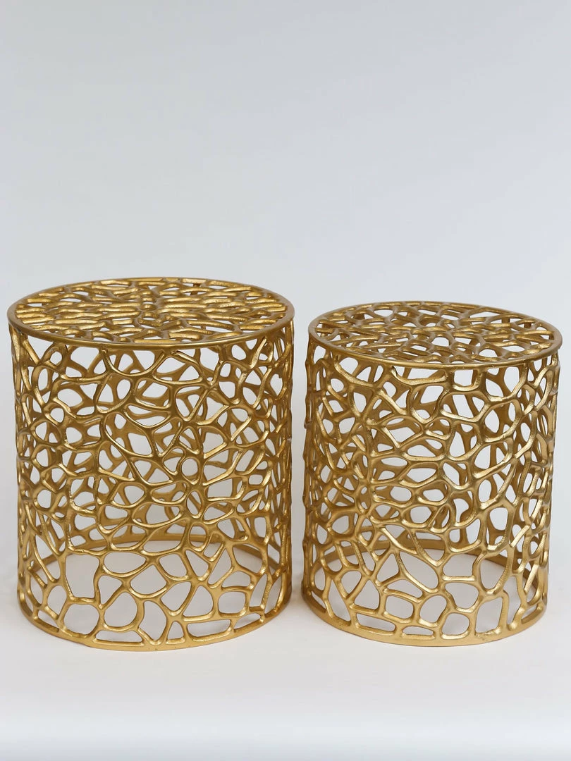 Description: These gold side tables are a perfect statement piece! They create the perfect base for your home decor layered display, and fit inside eahc other for easy storage!