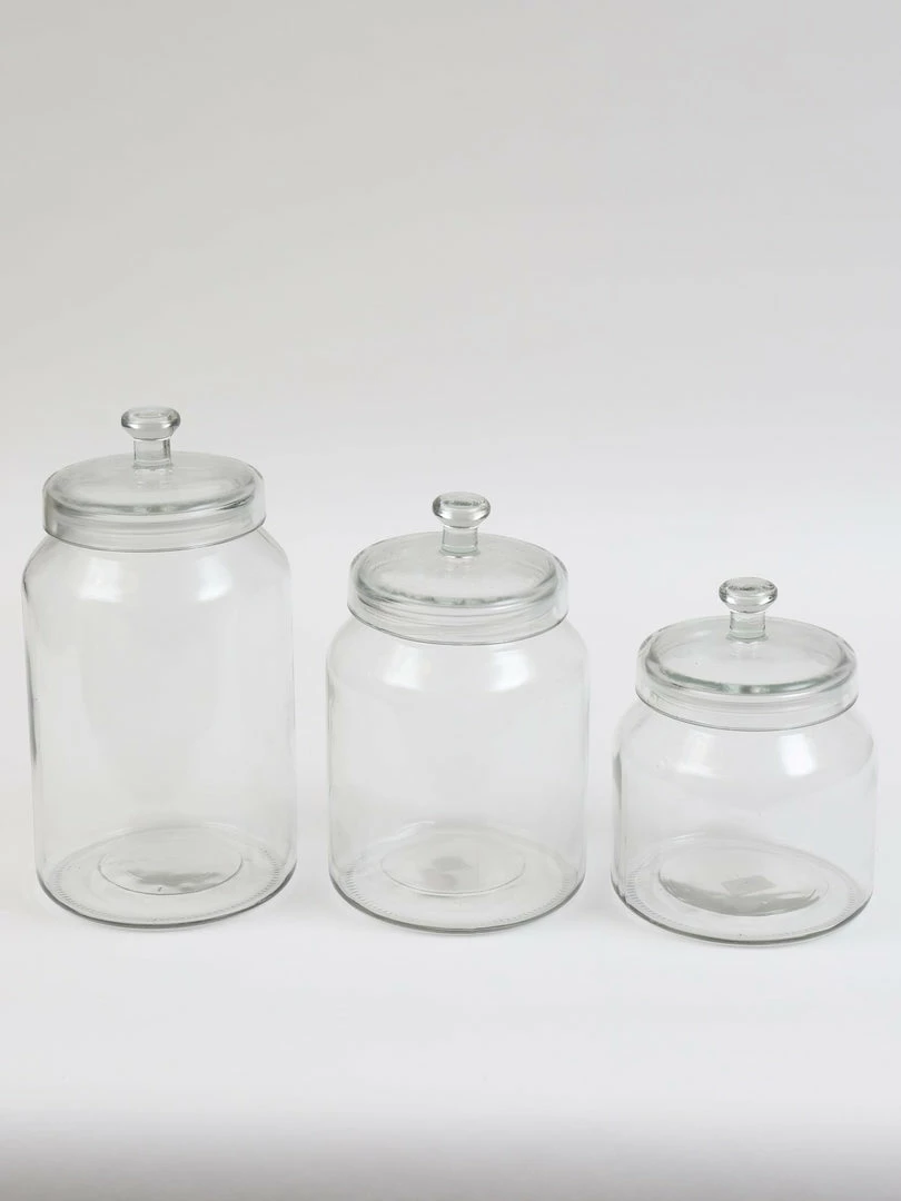 Description: This jar set is very versatile yet classic. Use them in your bathroom, vanity, kitchen, pantry, laundry room, etc. Available in 3 sizes, each size sold separately.