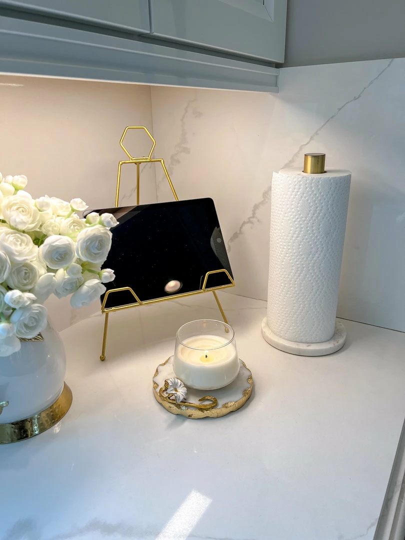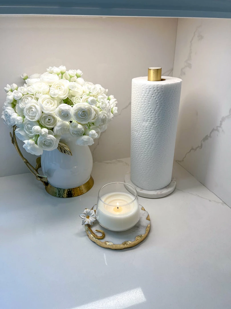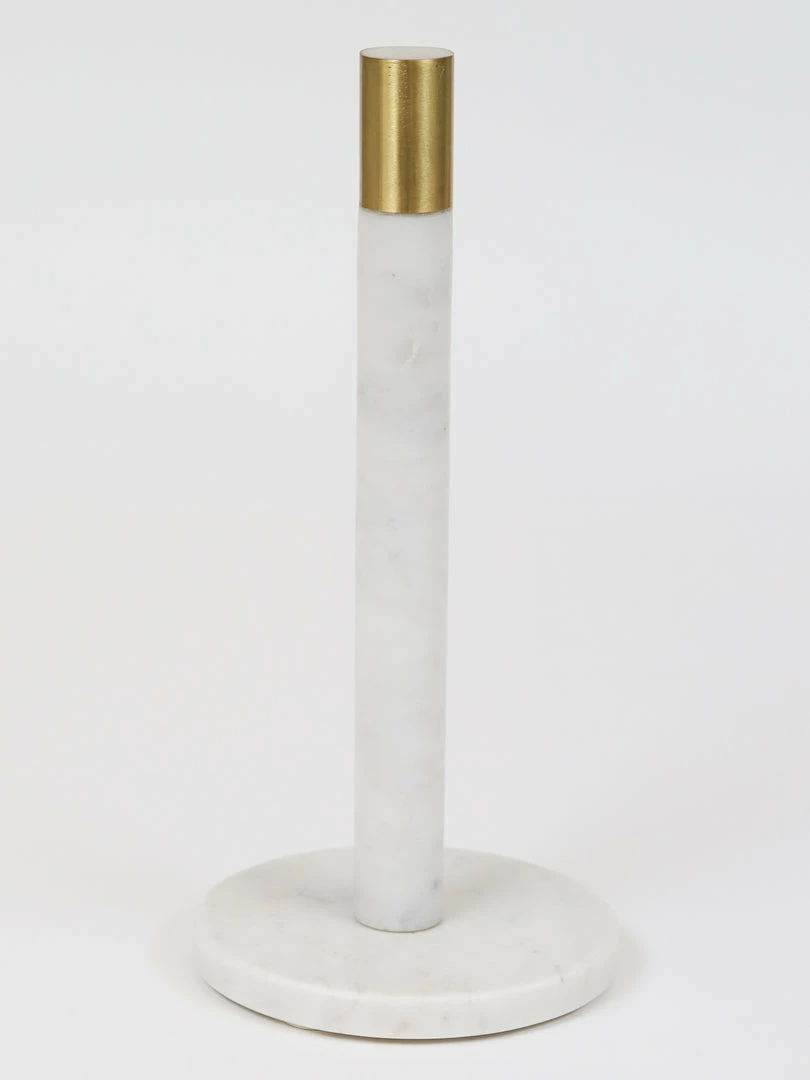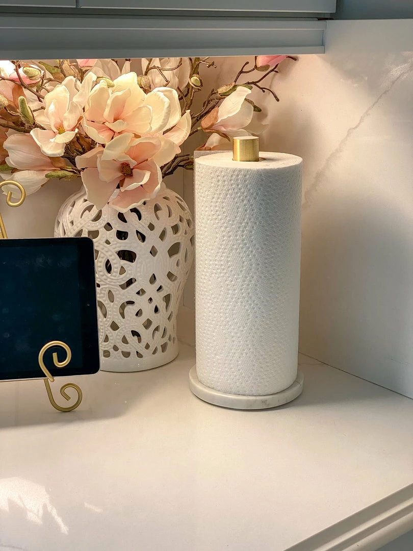 Description: We are in LOVE with this marble paper towel holder! The design is simple but elegant, with a completely marble base accented with a gold metal tip. Perfect for any home, and adds some elegance to your kitchen!