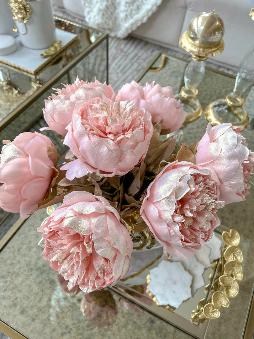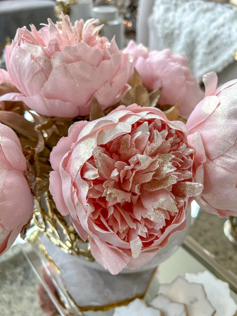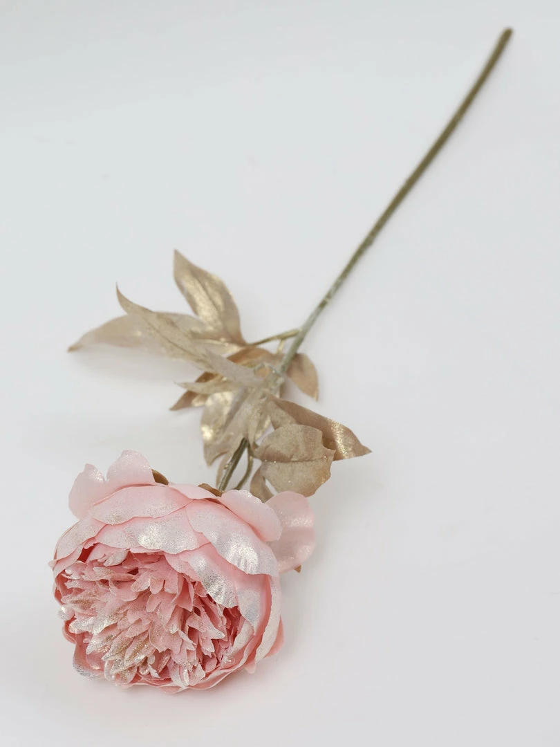 Description: This beautiful faux pink peony will add sparkle to your holiday display or during any season! The stunning color will add a pop of color to any room.