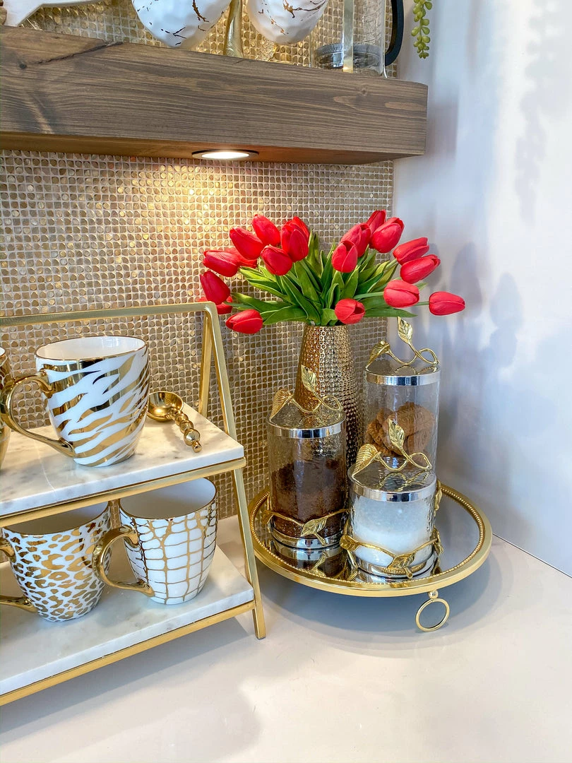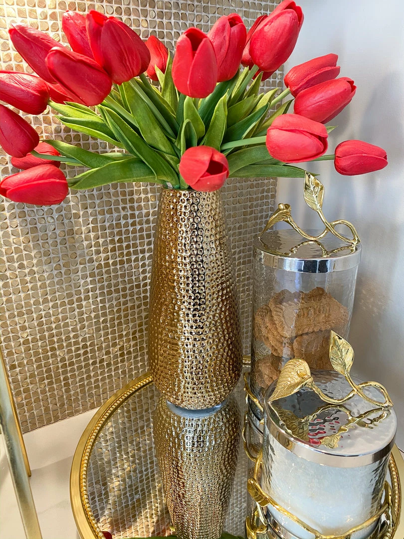 This polished hammered vase ties back perfectly to our polished gold hammered bottle neck vases and is a stunning piece when you add some faux florals. We love the hammered finish and how it ties together any room!