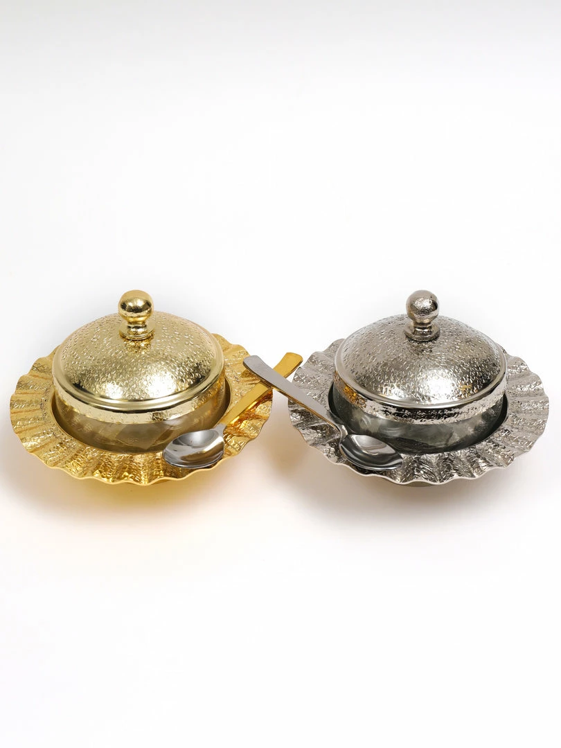Description: This universal jar has a gold hammered lid and can be used for almost anything! It will be great for sugar, honey, jam, etc. Comes with a matching spoon.